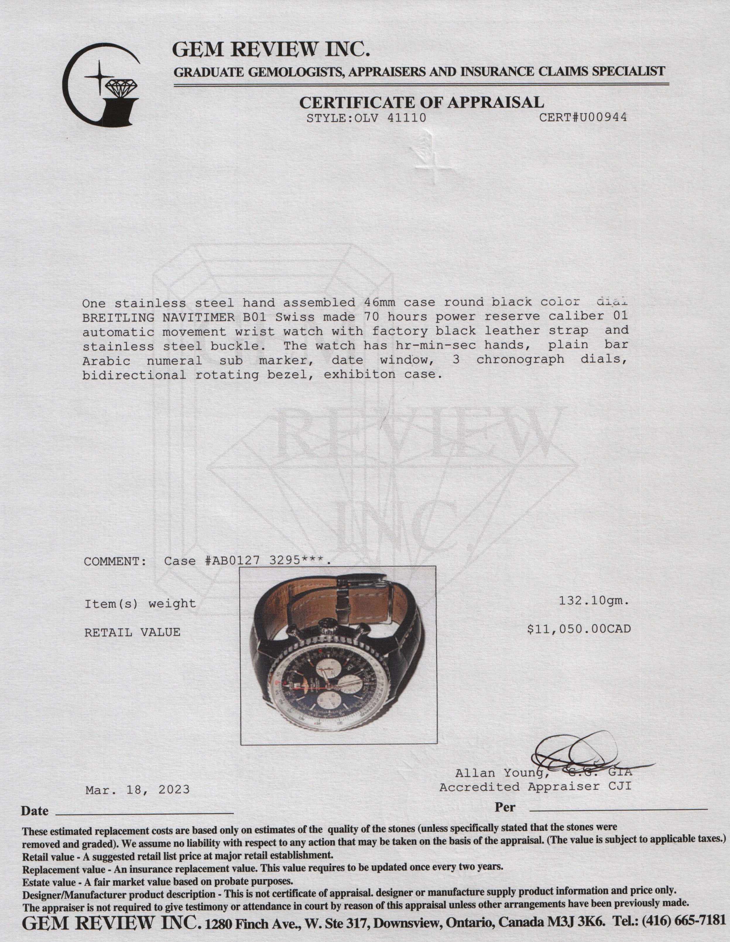 Included Items: Original Breitling Box, Card, Booklet & Gem Review Appraisal
