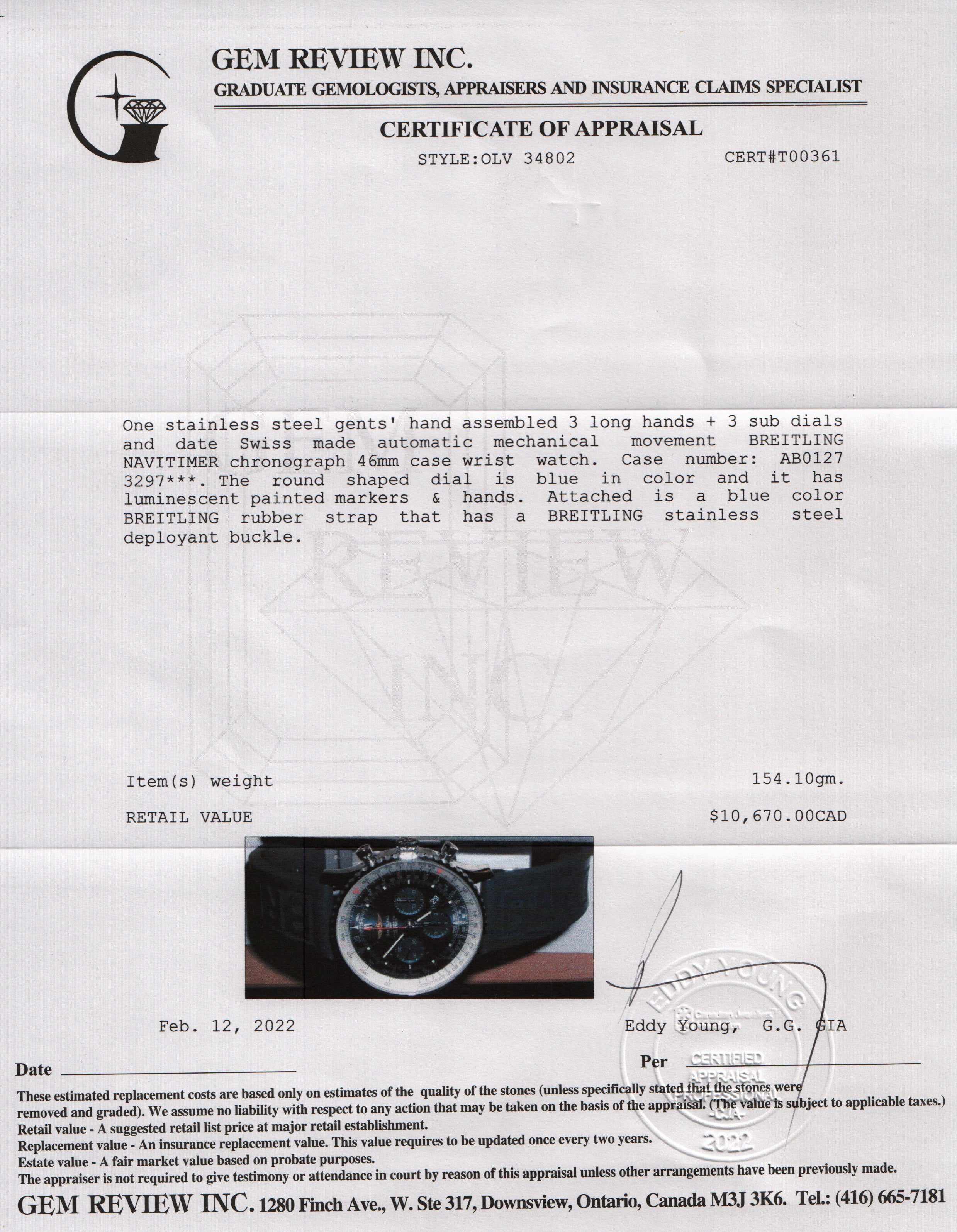 Included Items: Original Breitling Box, Receipt, Extra Blue Leather Strap & Gem Review Appraisal