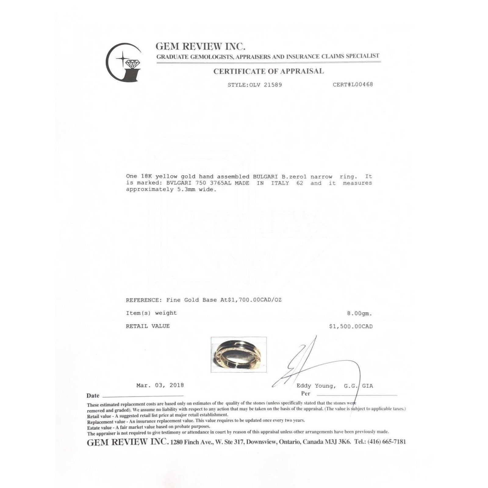 Bulgari B.Zero1 1-Band Ring in 18kt Yellow Gold; Bulgari Size 62, US Size 10; Comes with Gem Review Appraisal