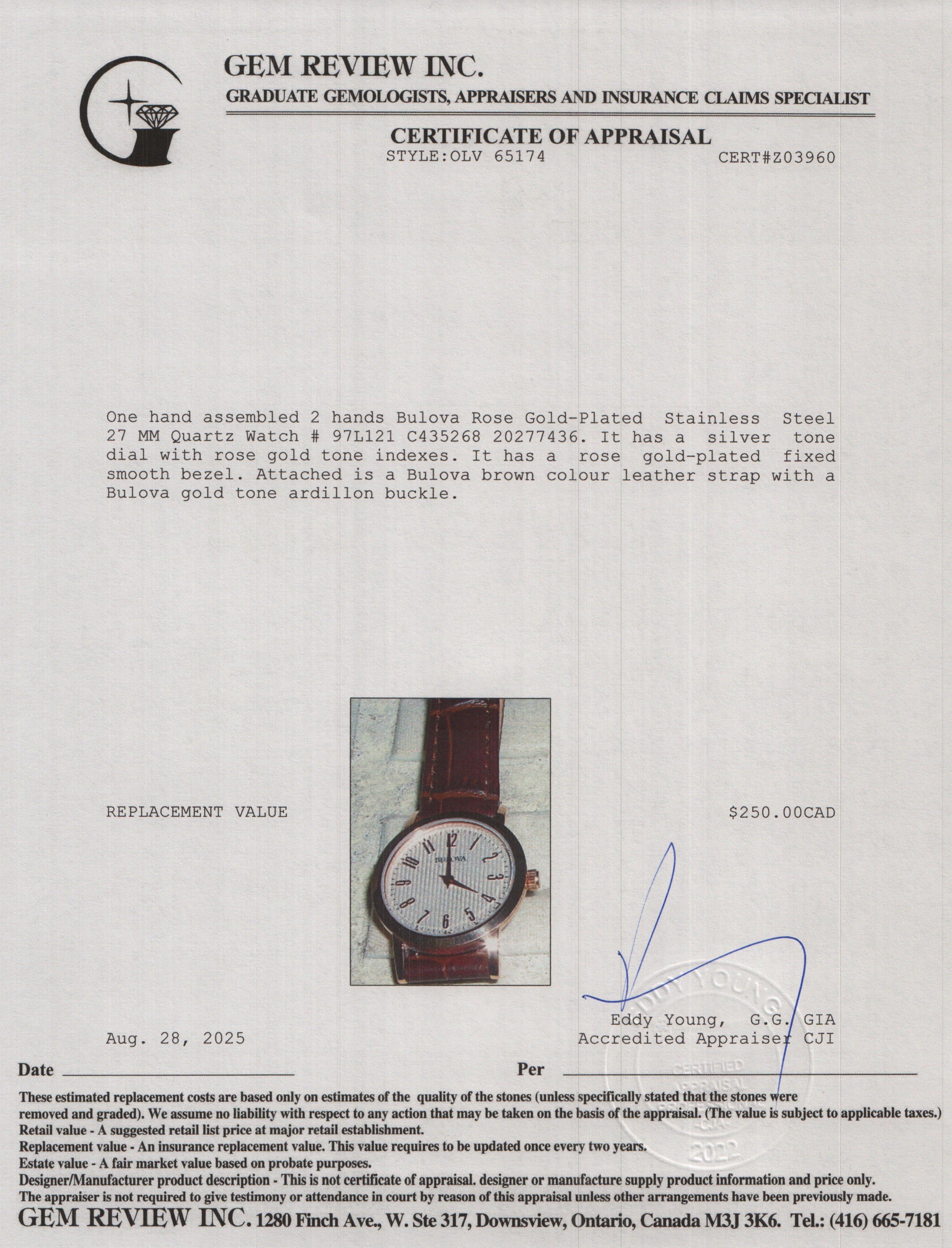 Rose Gold-Plated Stainless Steel 27 MM Quartz Watch White Dial 97L121 w/ Box
