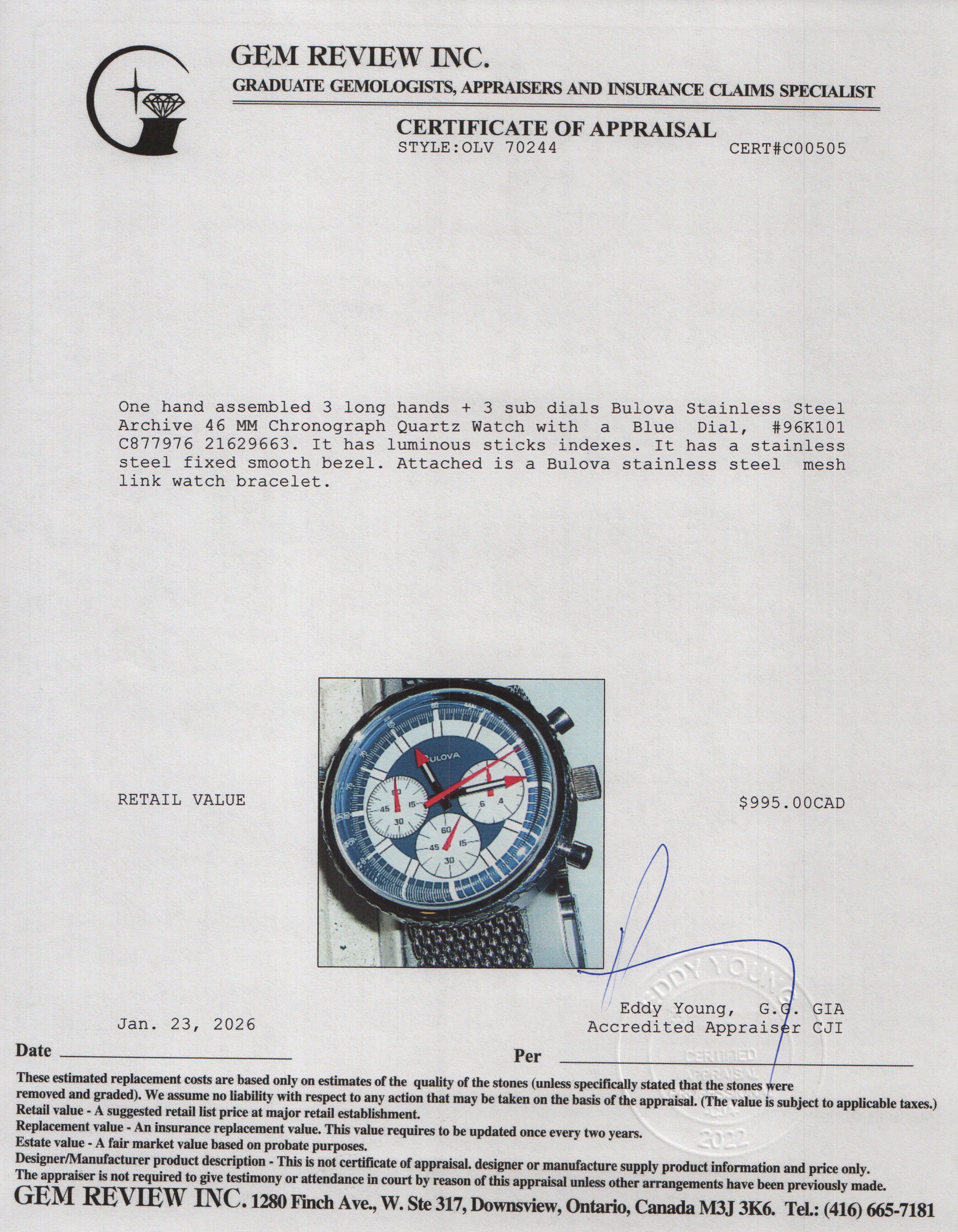 Stainless Steel Archive 46 MM Chronograph Quartz Watch Blue Dial 96K101 w/ Box