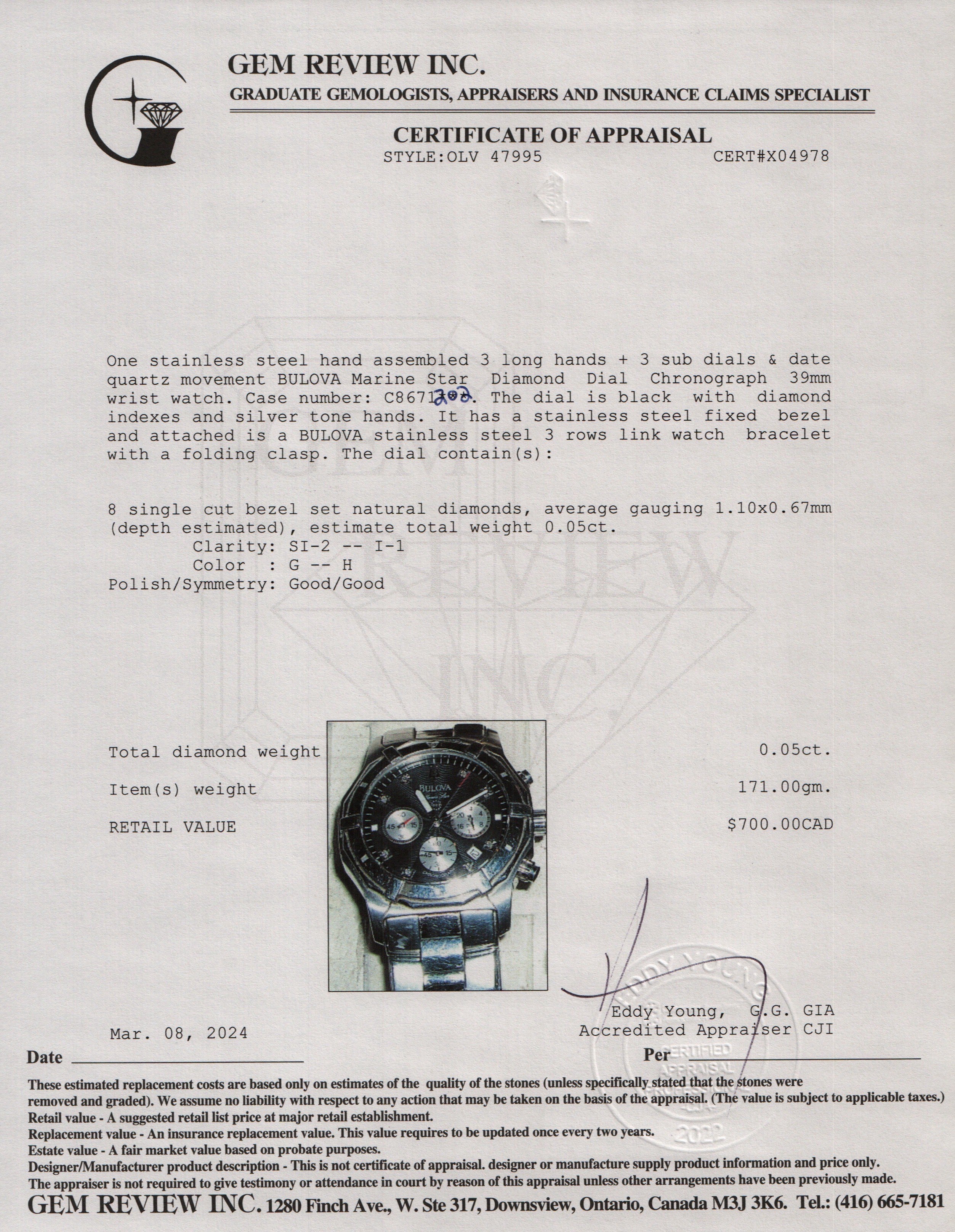 Stainless Steel Marine Star Diamond Dial 39 MM Chronograph Watch