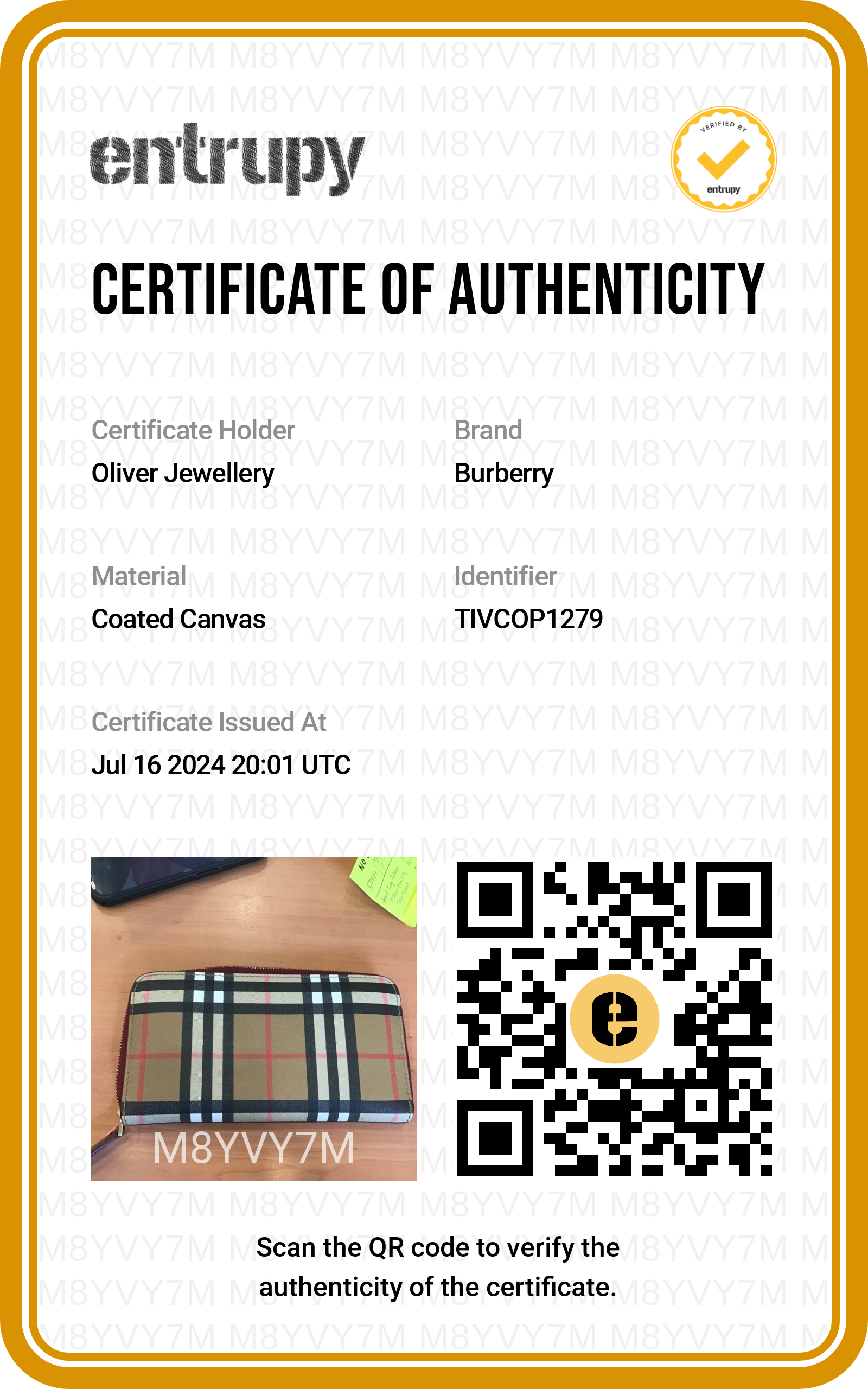 Entrupy Certificate of Authenticity