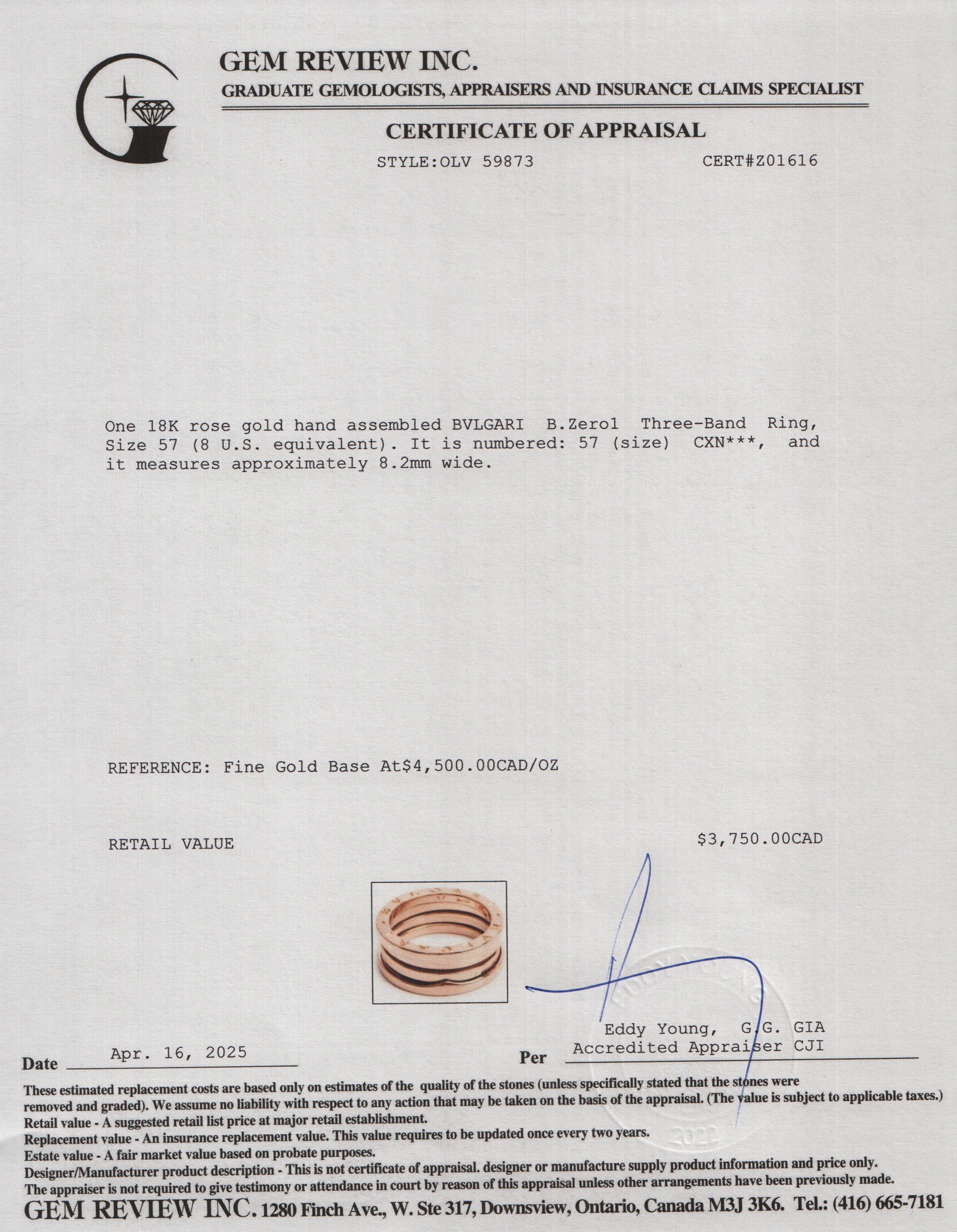 BVLGARI 18k Rose Gold B.Zero1 Three-Band Ring, Size 57 8 w/ Box