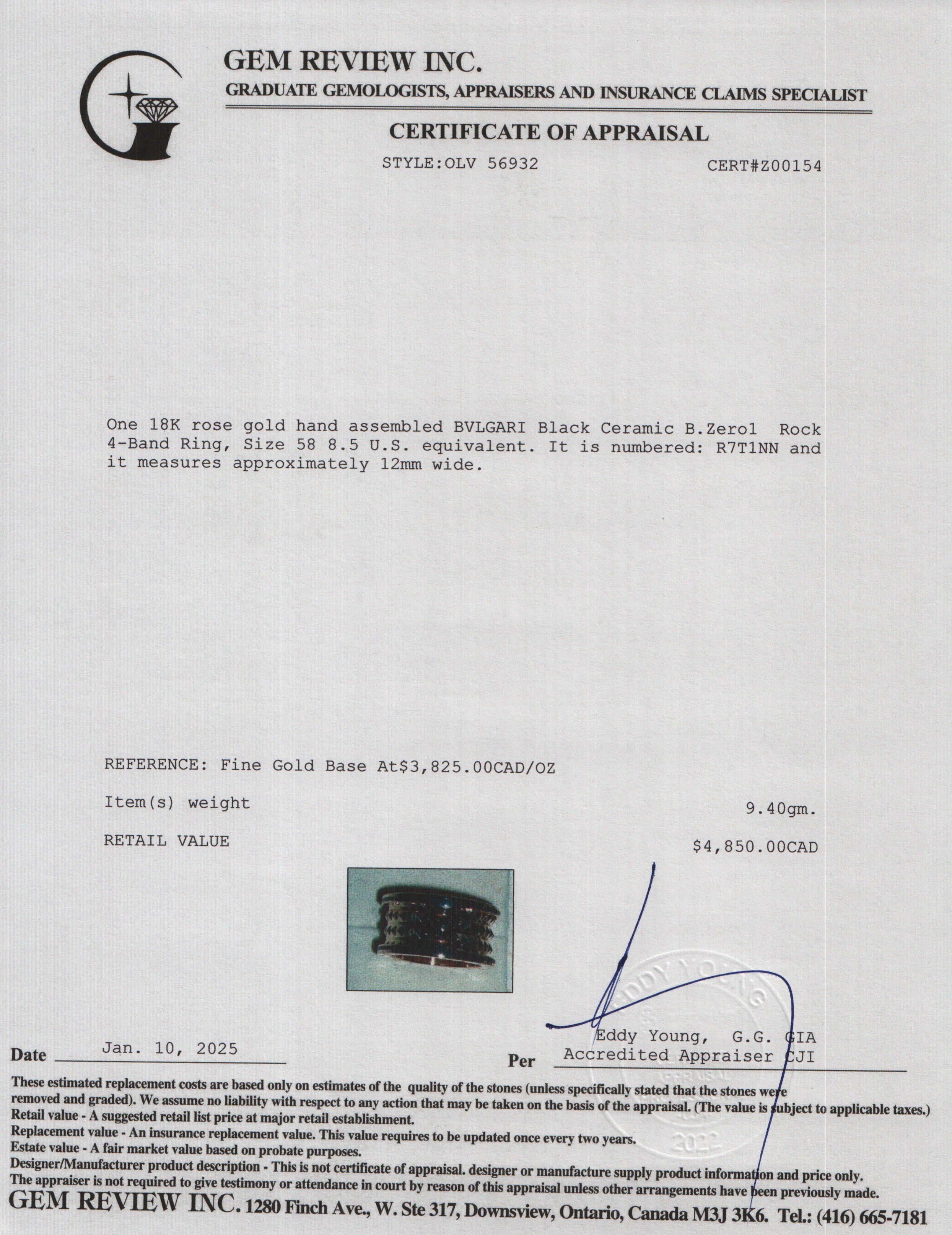 BVLGARI 18k Rose Gold & Black Ceramic B.Zero1 Rock 4-Band Ring, Size 58 8.5 w/ Box