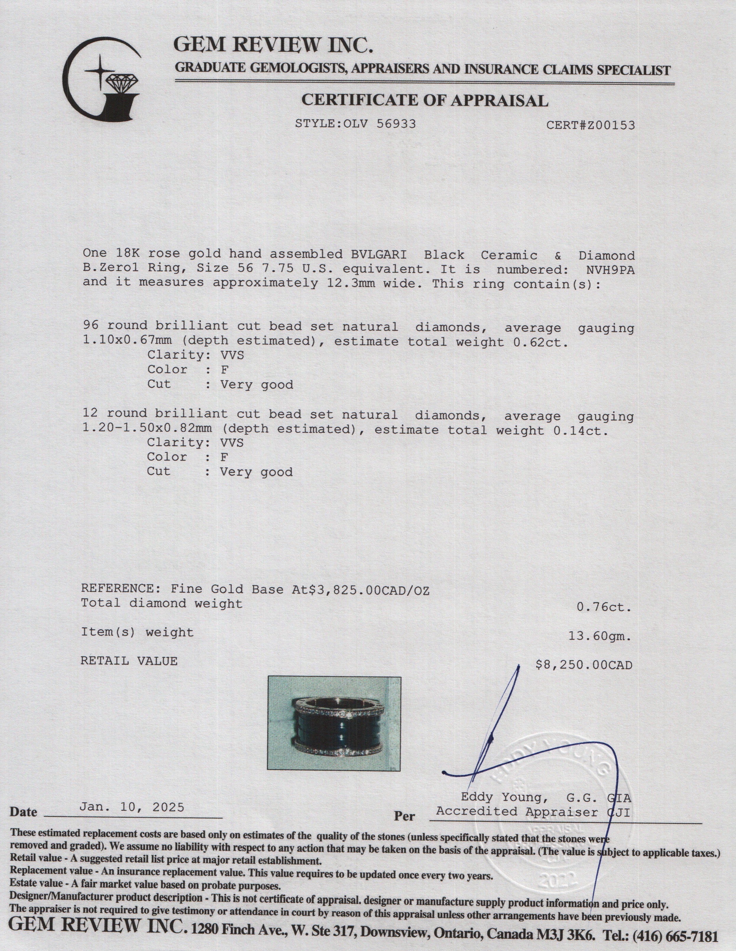 BVLGARI 18k Rose Gold Black Ceramic & Diamond B.Zero1 Ring, Size 56 7.75 w/ Box