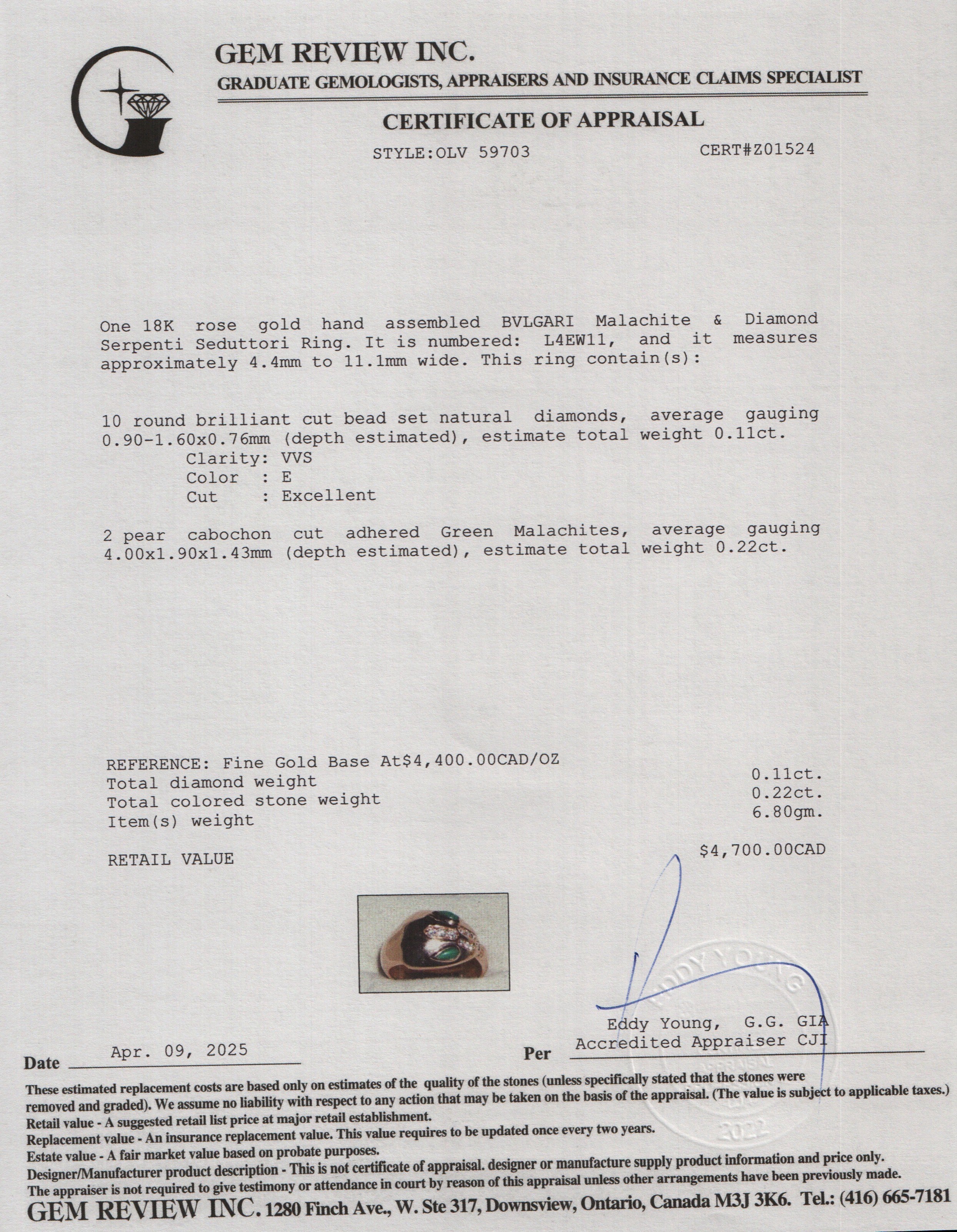 BVLGARI 18k Rose Gold Malachite & Diamond Serpenti Seduttori Ring, Size 5.5 w/ Box & Certificate