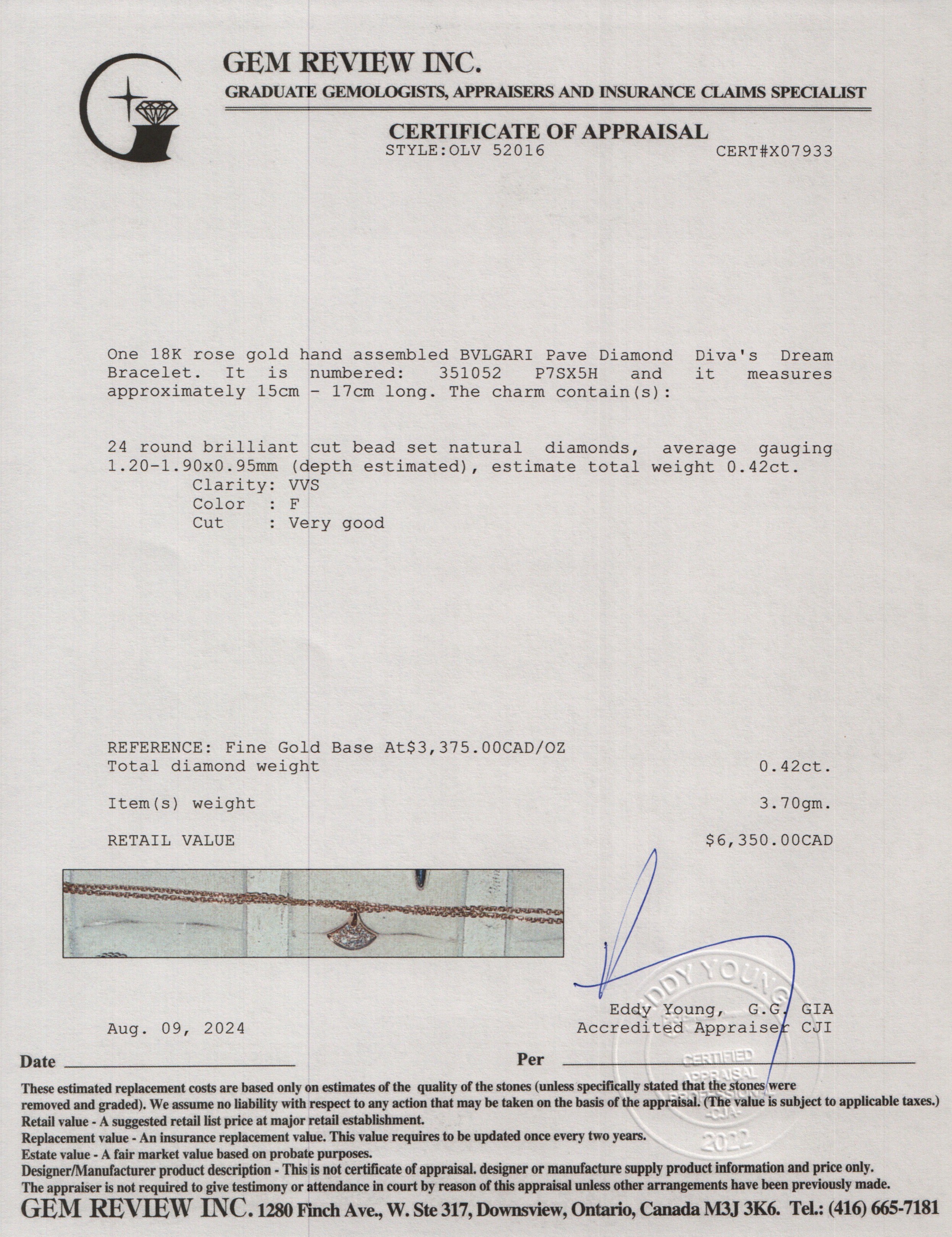 BVLGARI 18k Rose Gold Pave Diamond Diva's Dream Bracelet w/ Box & Certificate