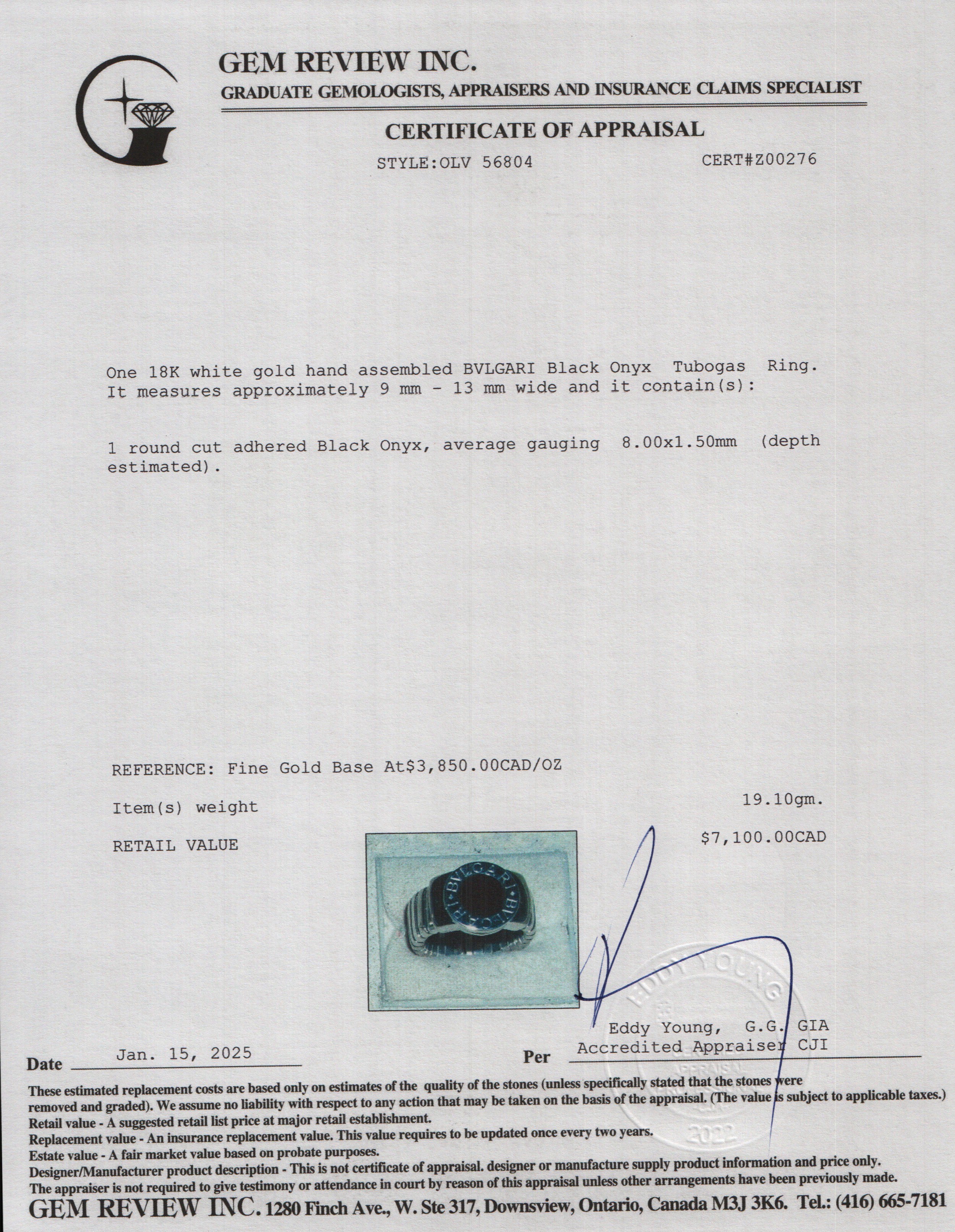 BVLGARI 18k White Gold Black Onyx Tubogas Ring, Size 7