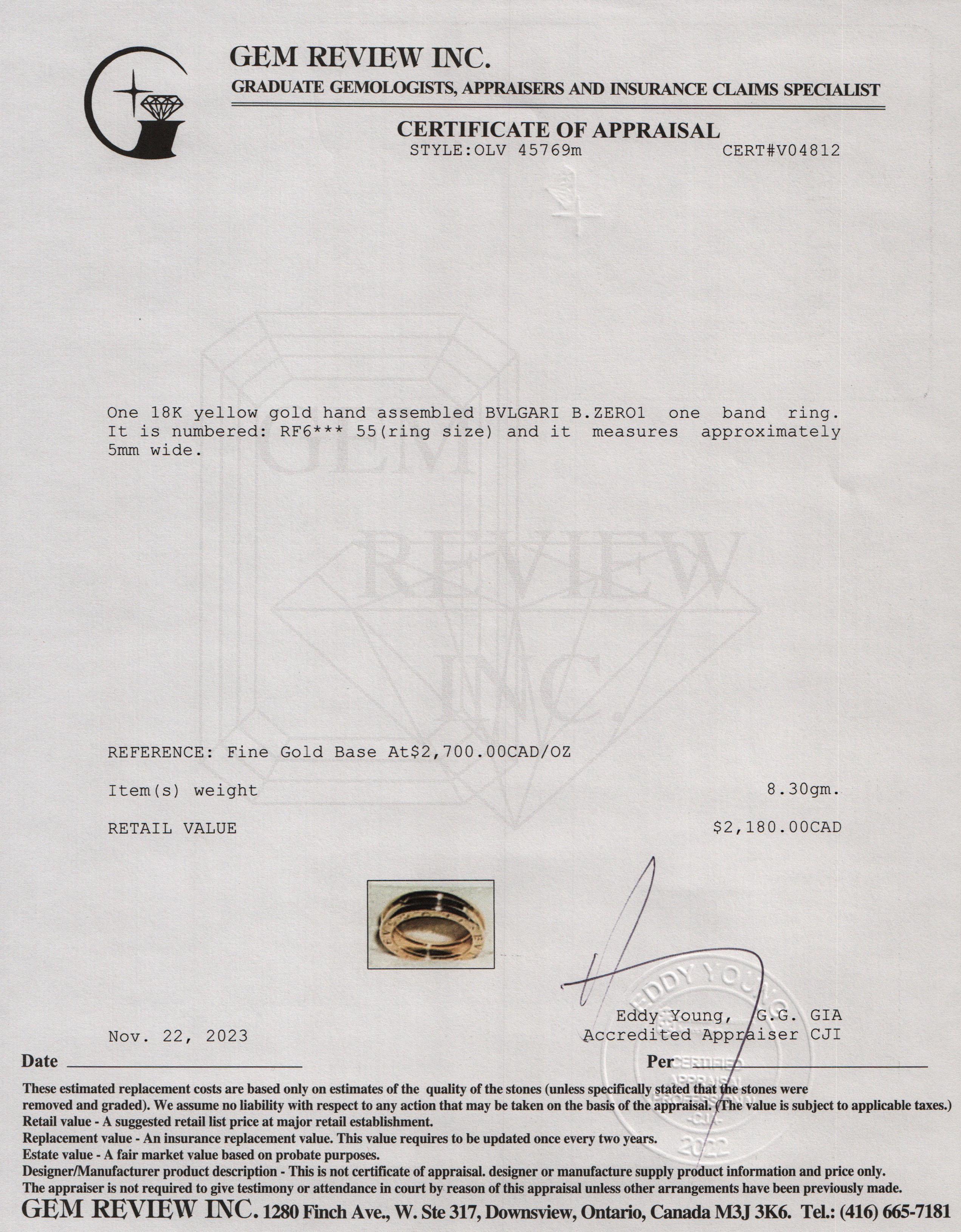 BVLGARI 18k Yellow Gold B.Zero1 1-Band Ring, Size 55 7.25 w/ Box & Certificate