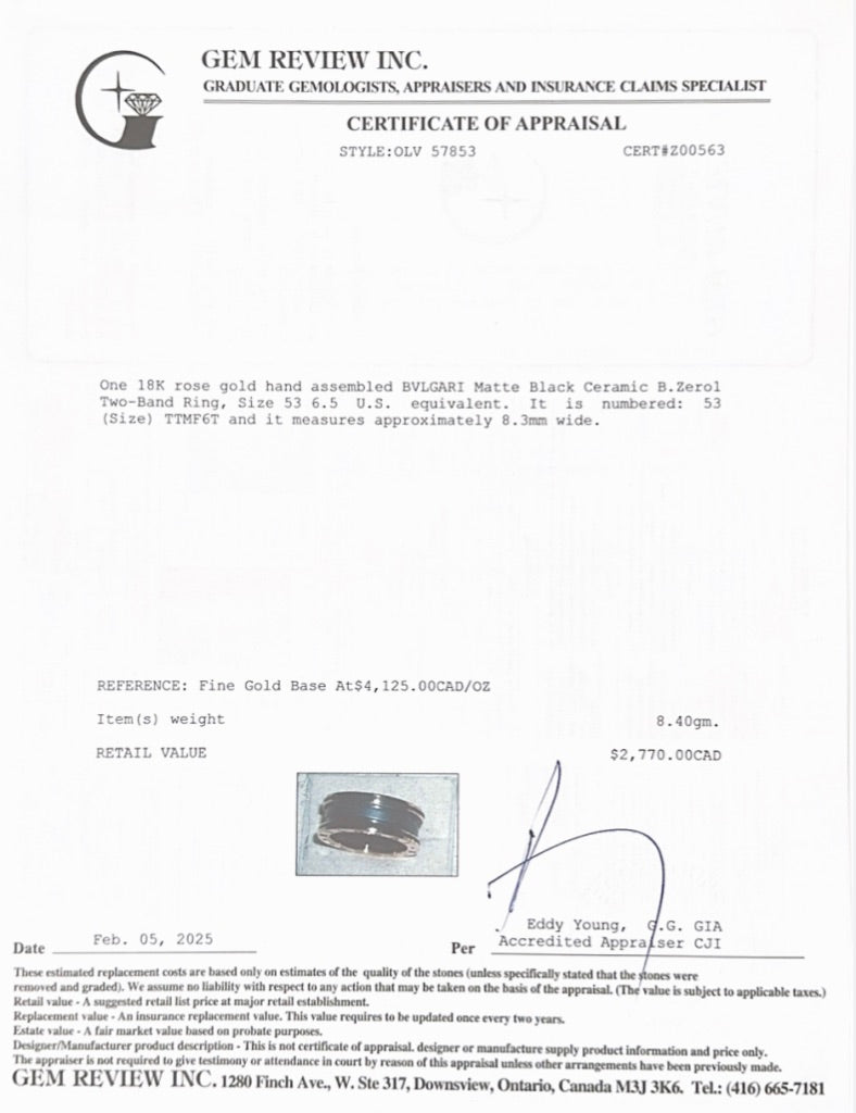 BVLGARI 2022 18k Rose Gold Matte Black Ceramic B.Zero1 Two-Band Ring, Size 53 6.5 w/ Box & Certificate