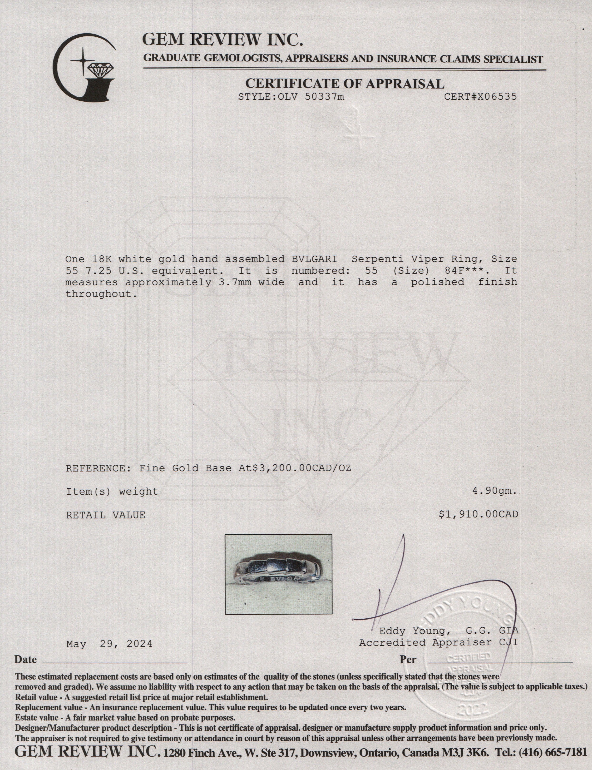 BVLGARI 2023 18k White Gold Serpenti Viper Ring, Size 55 7.25 w/ Box & Certificate