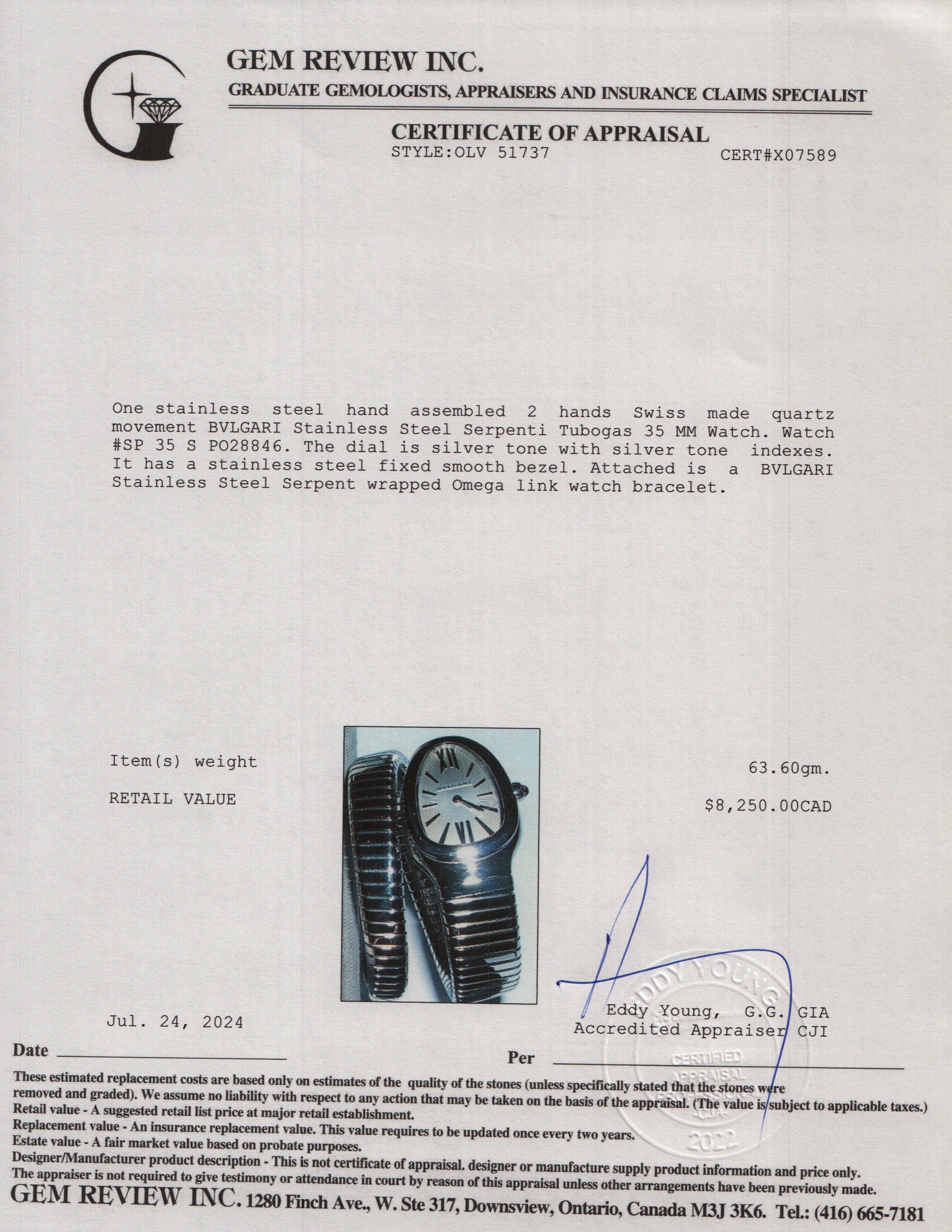 BVLGARI Stainless Steel Serpenti Tubogas 35 MM Watch w/ Box & Papers