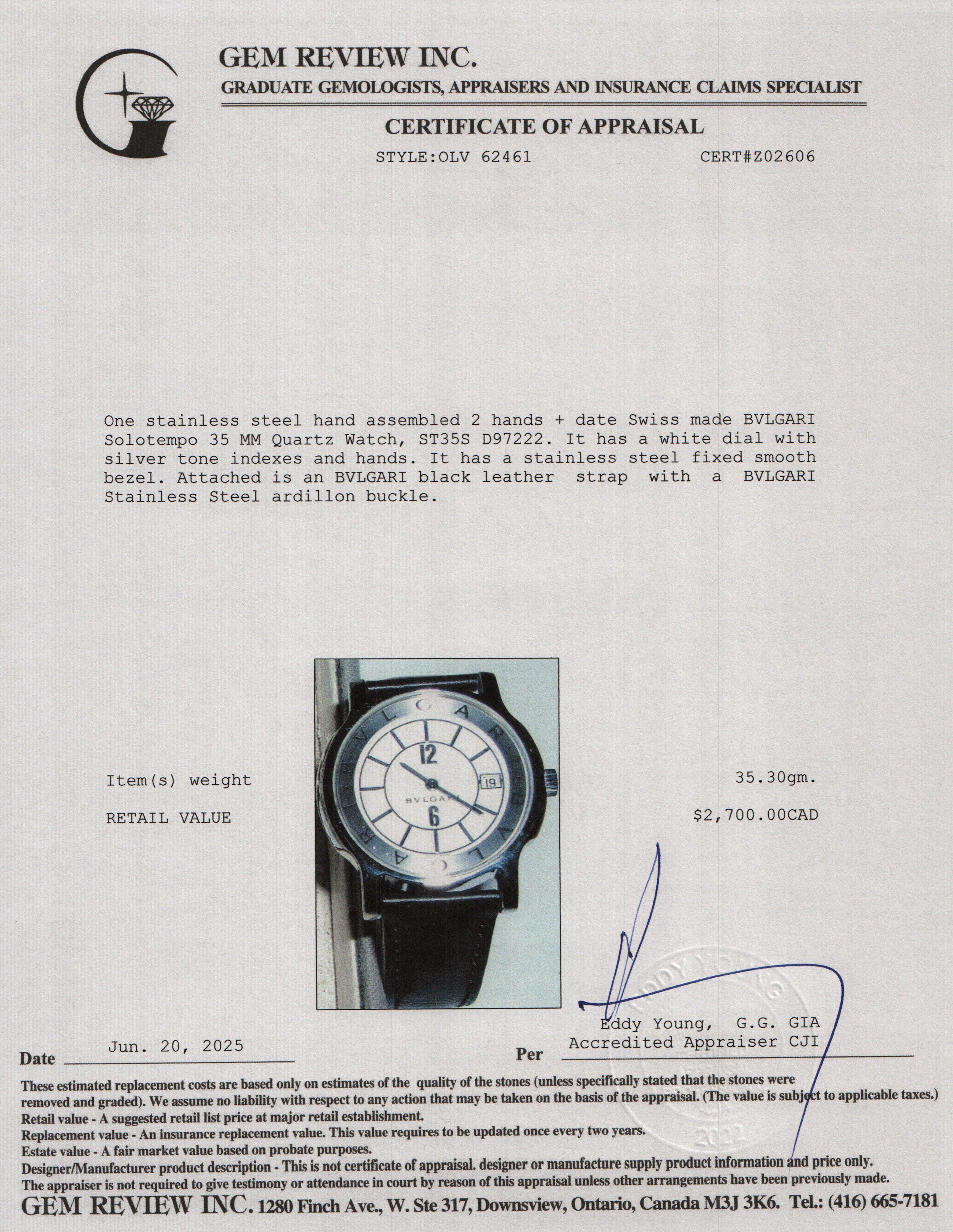 BVLGARI Stainless Steel Solotempo 35 MM Quartz Watch w/ Box & Papers