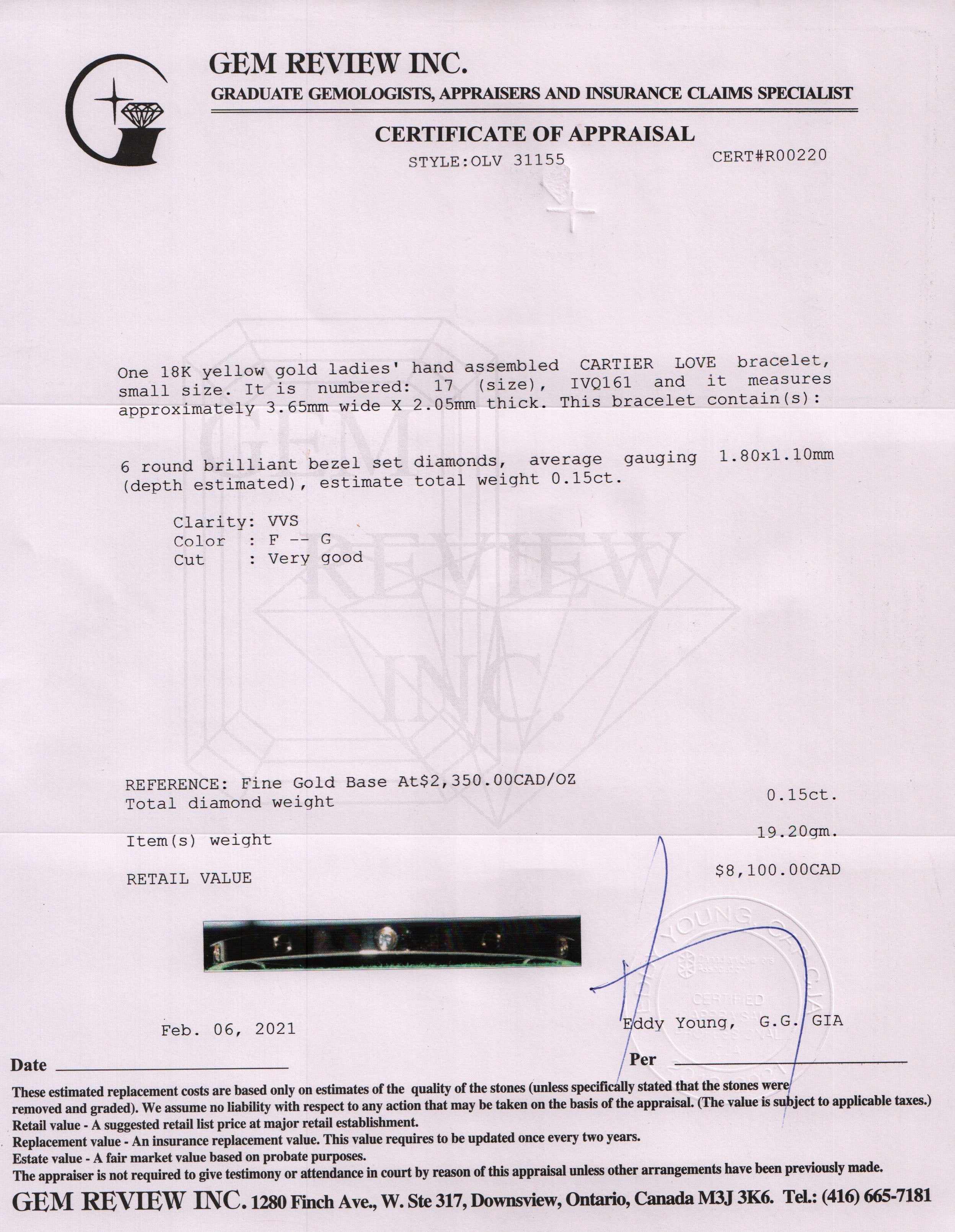 Cartier 18k Gold 6 Diamond Love Bracelet, Small Model w/ Box