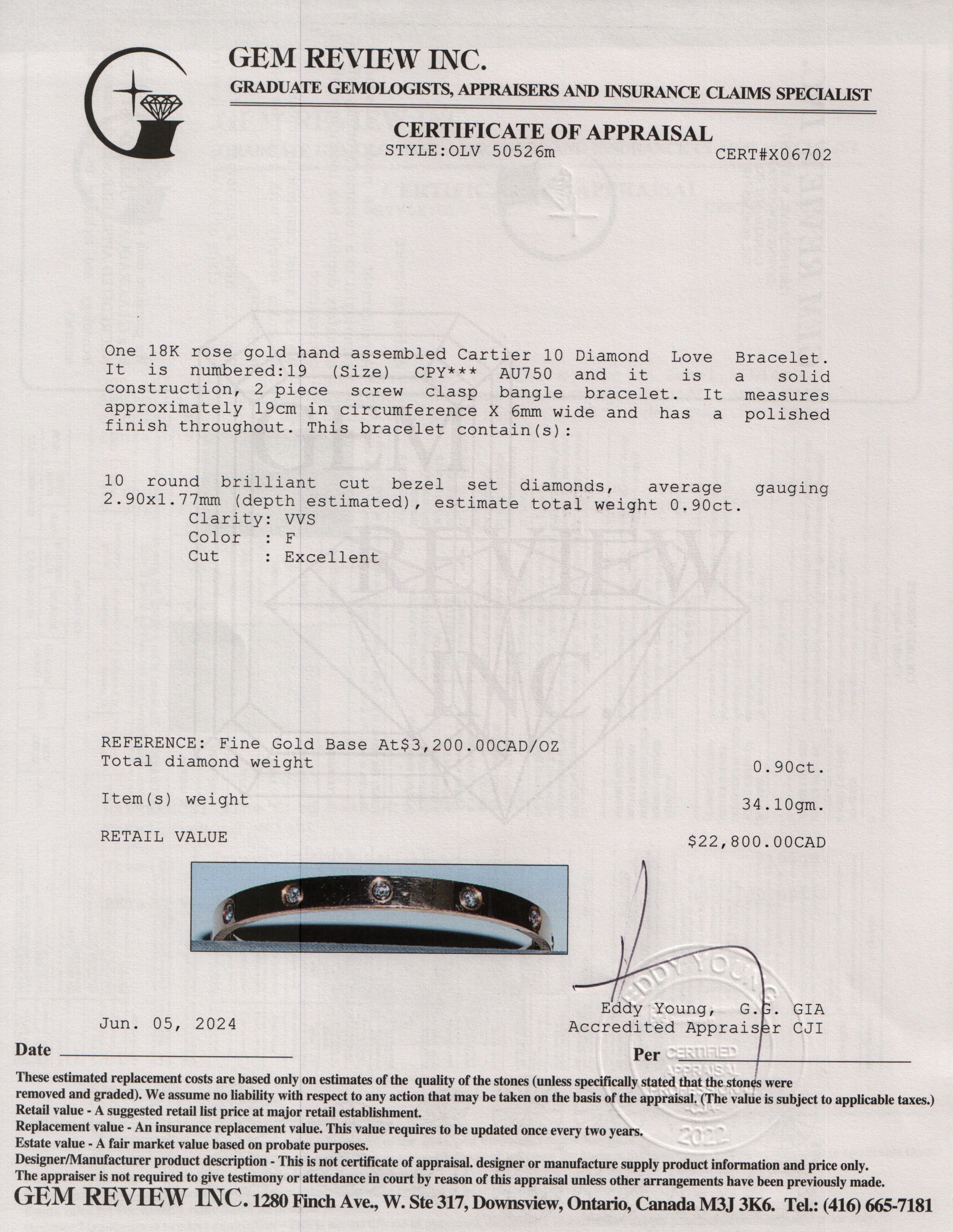 18k Rose Gold 10 Diamond Love Bracelet, Size 19 w/ Box