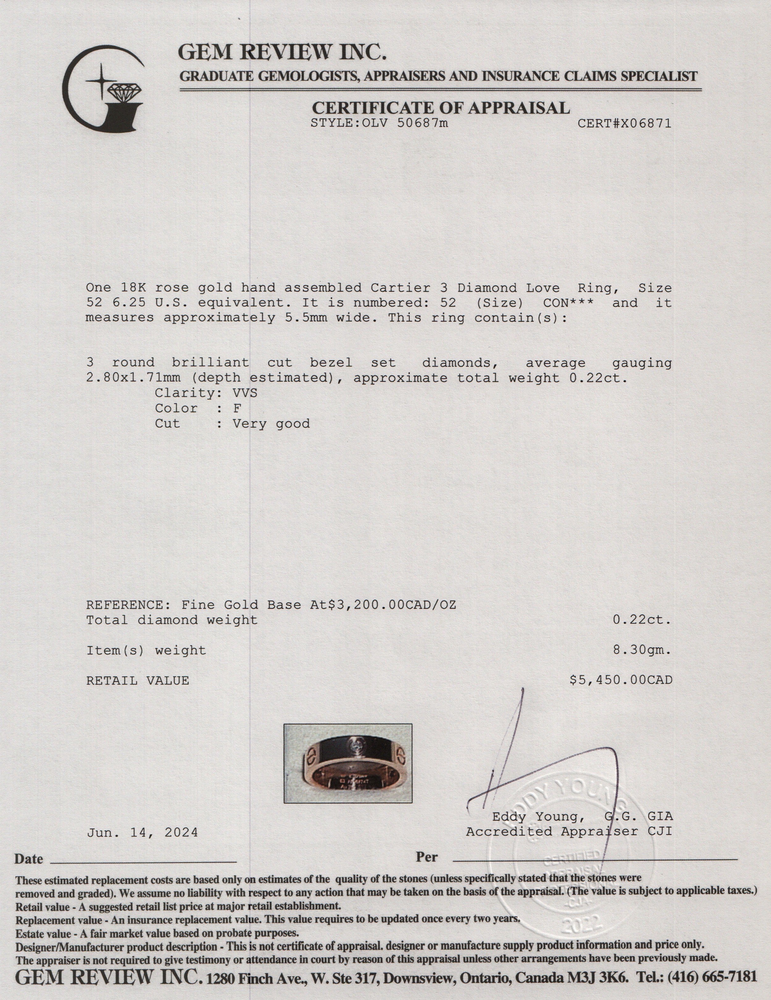 18k Rose Gold 3 Diamond Love Ring, Size 52 6.25