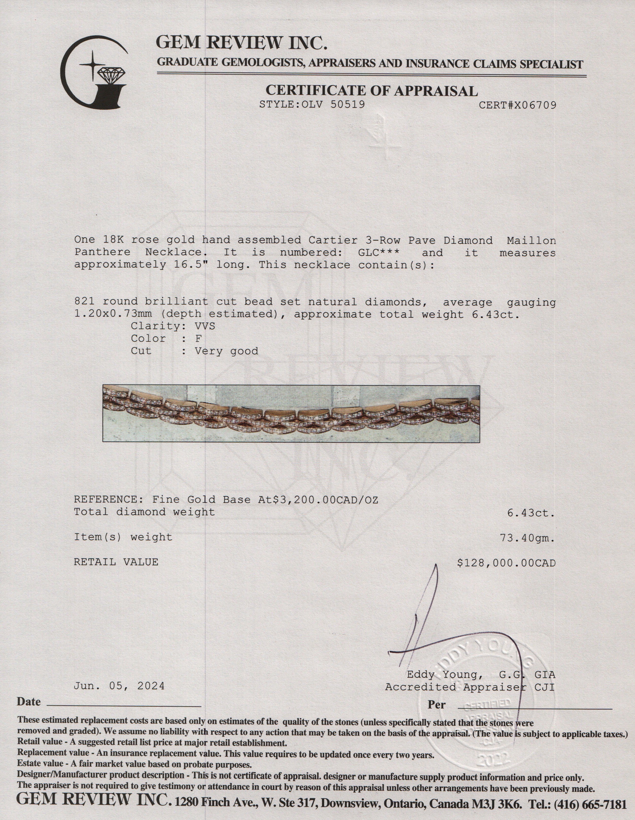 18k Rose Gold 3-Row Pave Diamond Maillon Panthere Necklace w/ Box