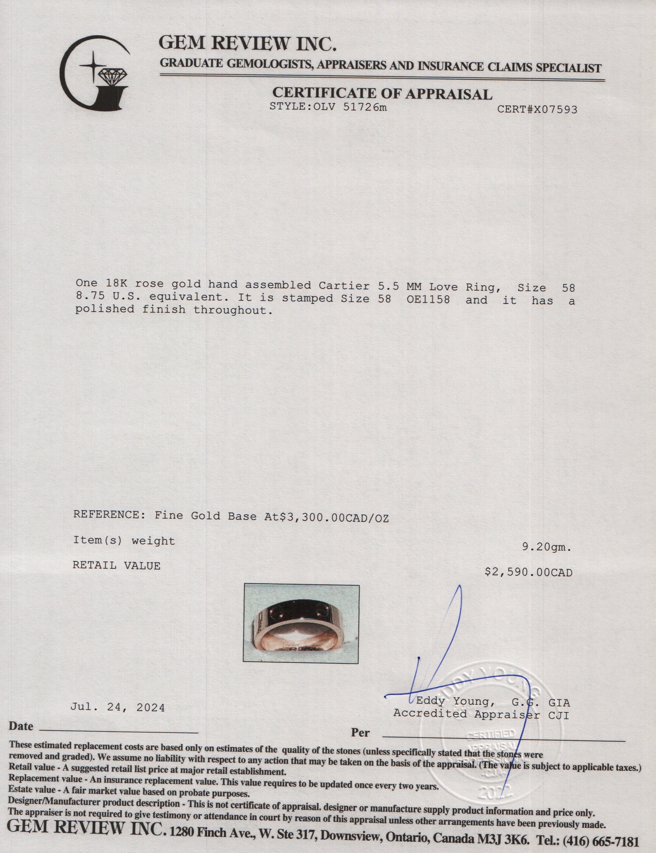 18k Rose Gold 5.5 MM Love Ring, Size 58 8.75
