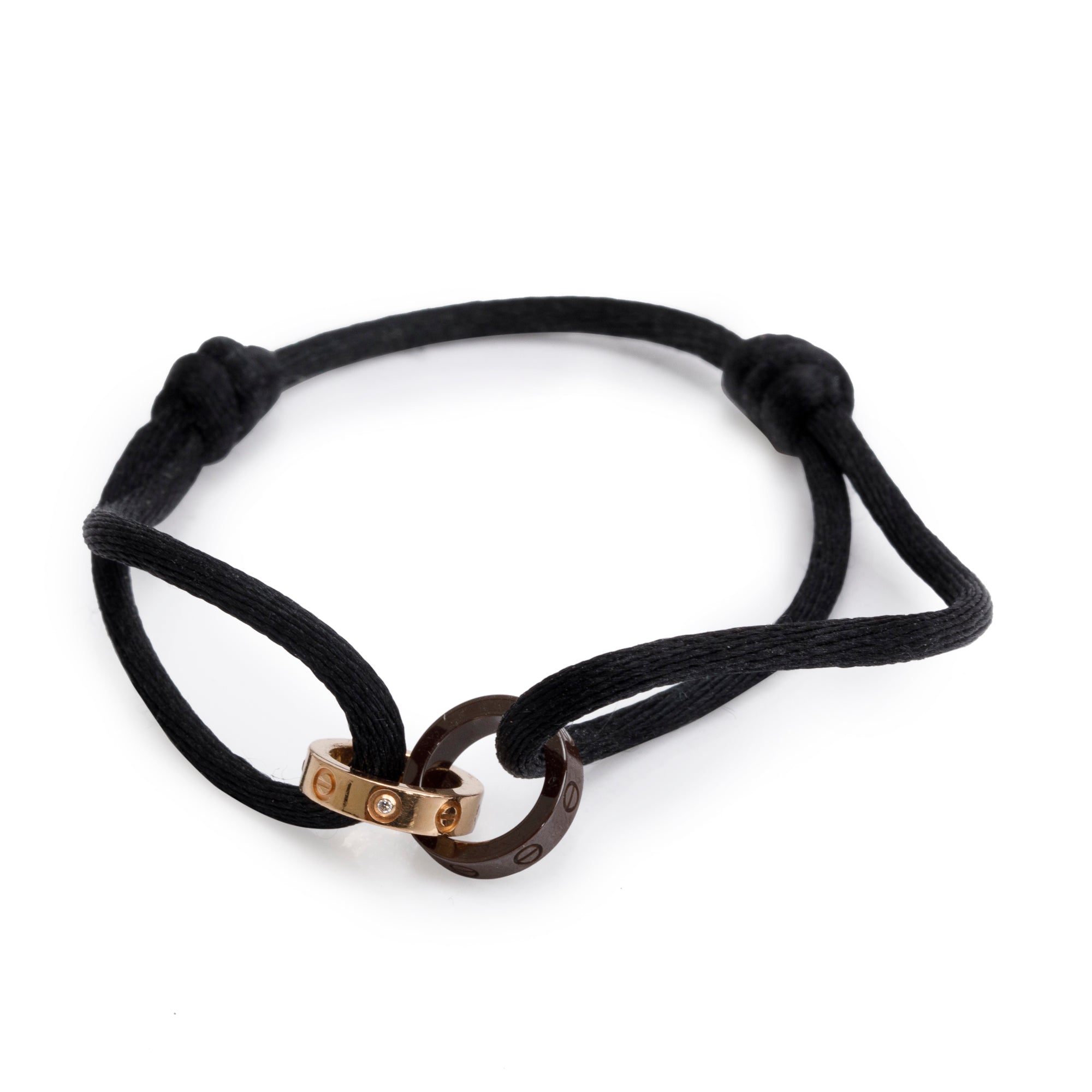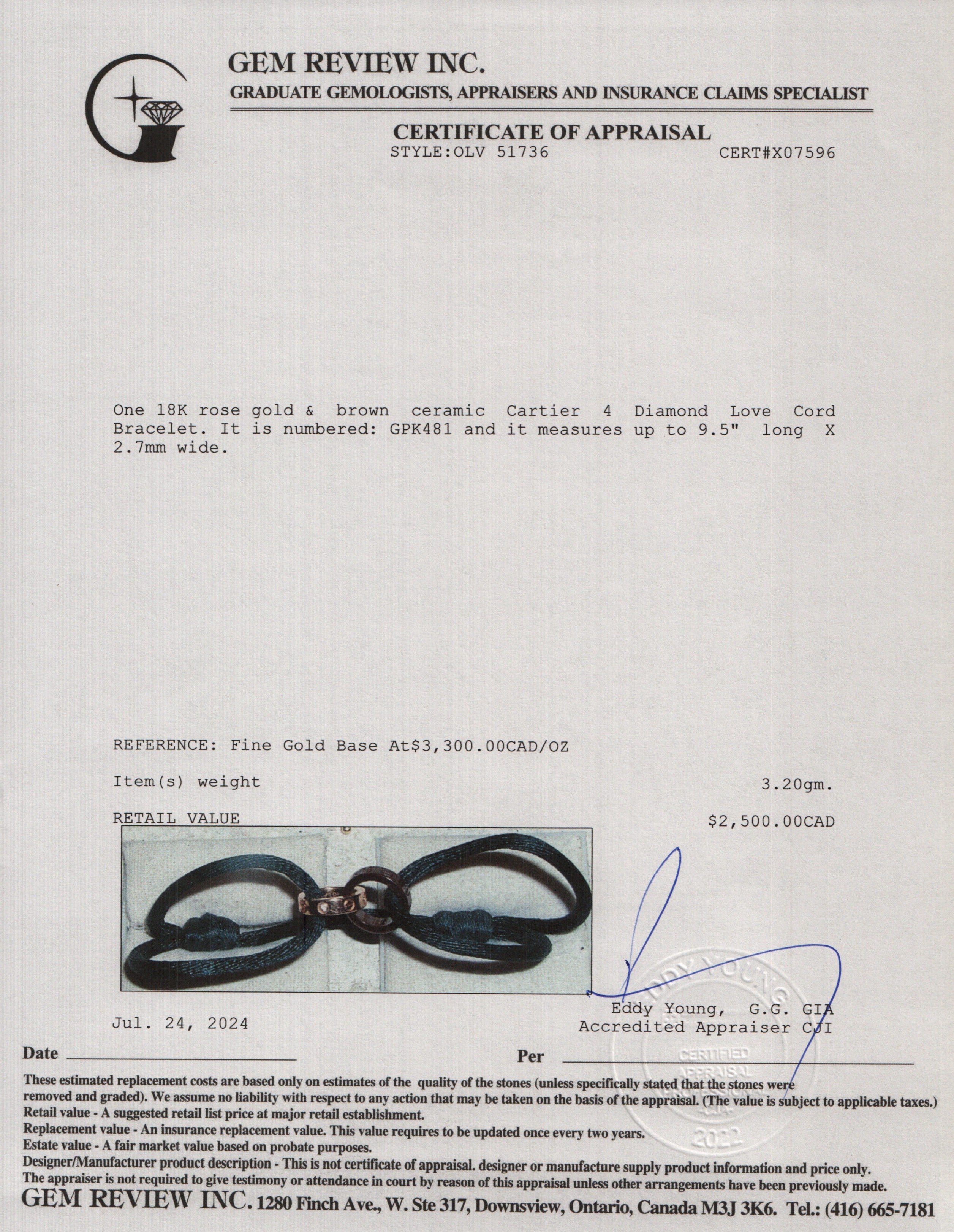 18k Rose Gold & Brown Ceramic 4 Diamond Love Cord Bracelet w/ Box & Authenticity Card