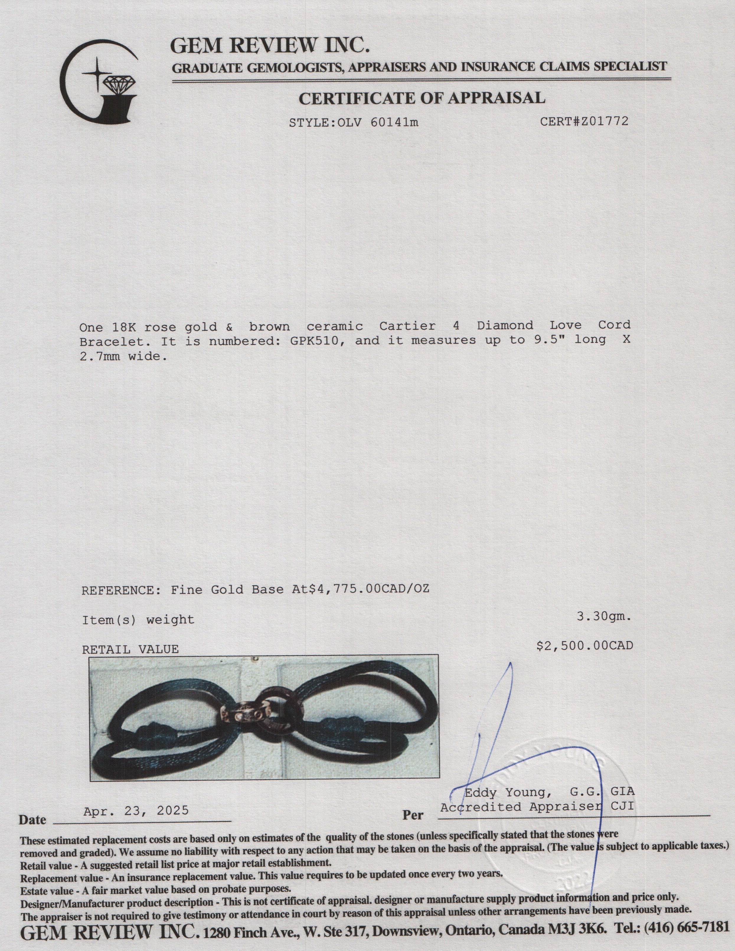18k Rose Gold & Ceramic 4 Diamond Love Cord Bracelet w/ Box & Certificate
