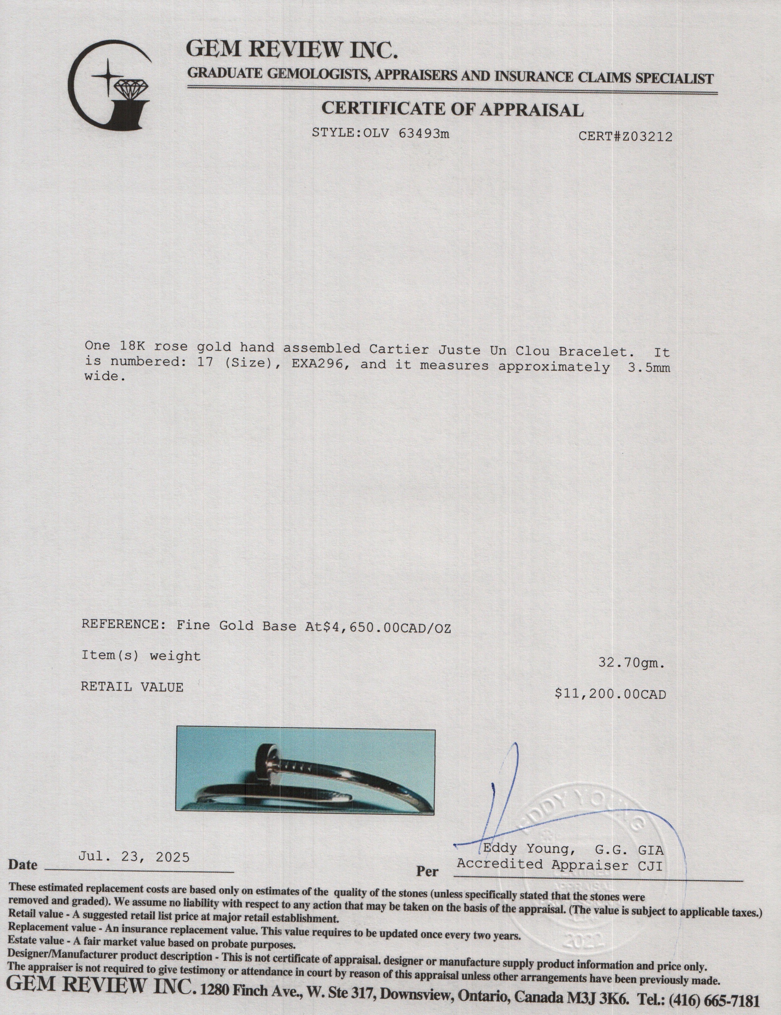 18k Rose Gold Juste Un Clou Bracelet, Size 17 w/ Box & Certificate