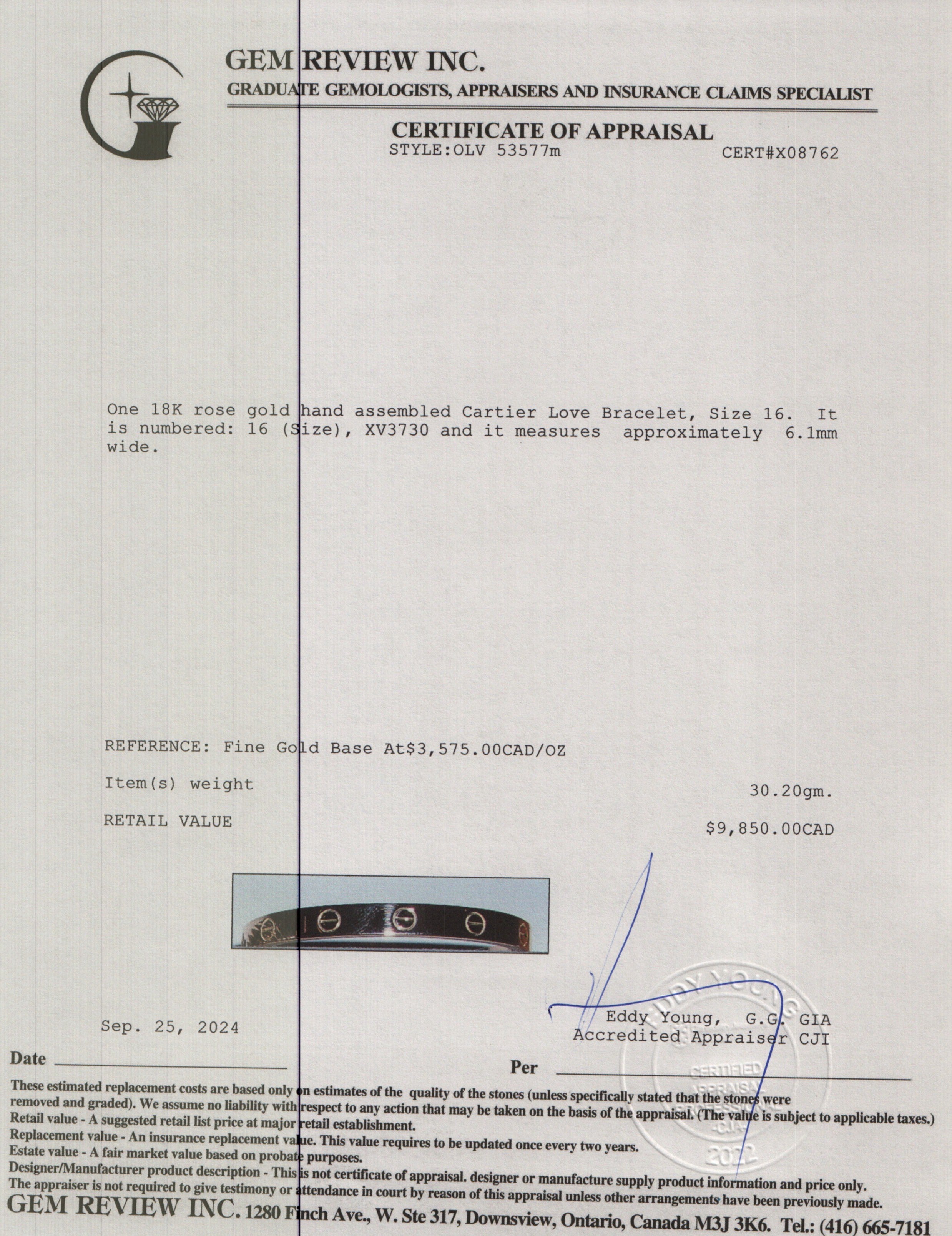 18k Rose Gold Love Bracelet, Size 16 w/ Box & Certificate