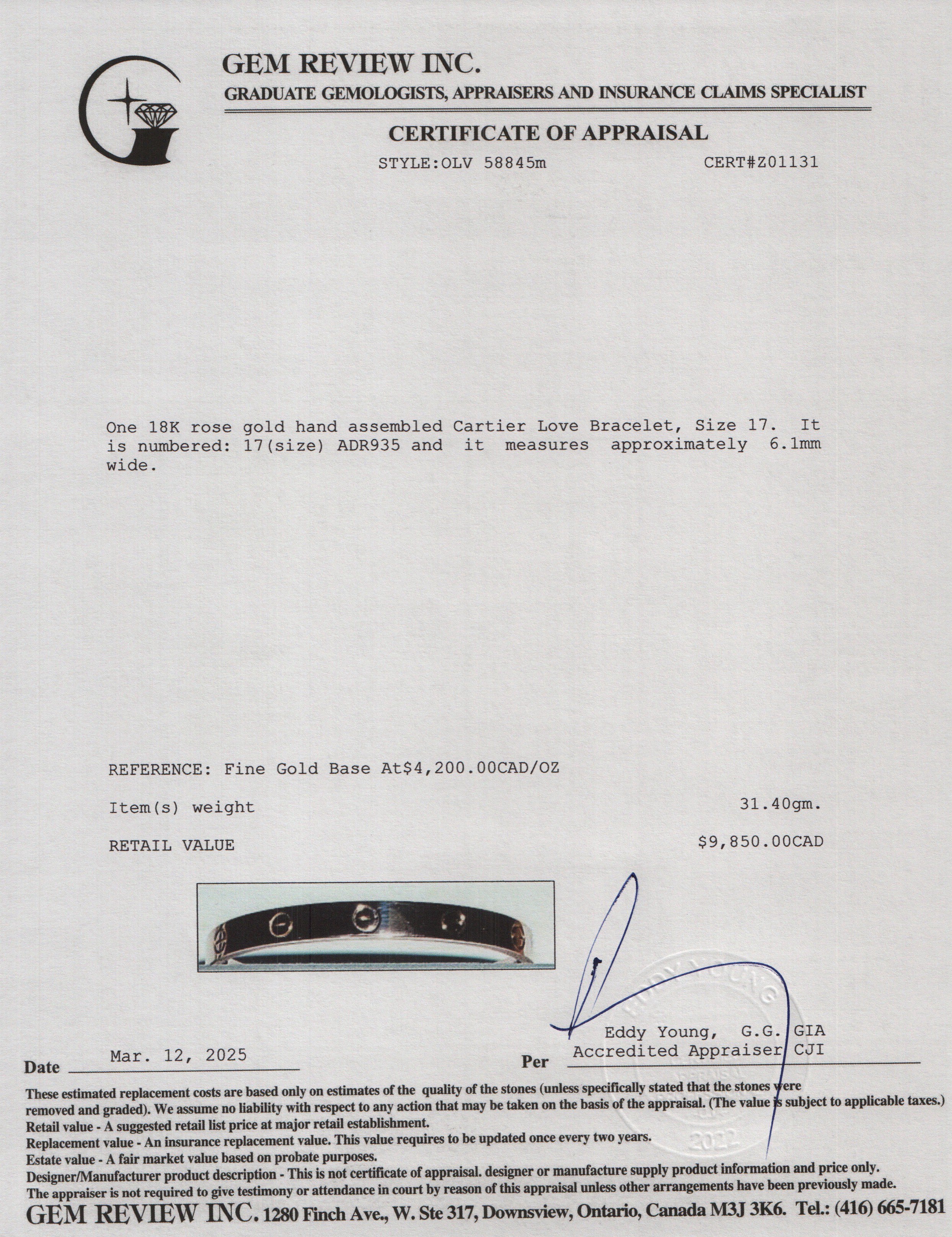 18k Rose Gold Love Bracelet, Size 17 w/ Box, Receipt & Certificate