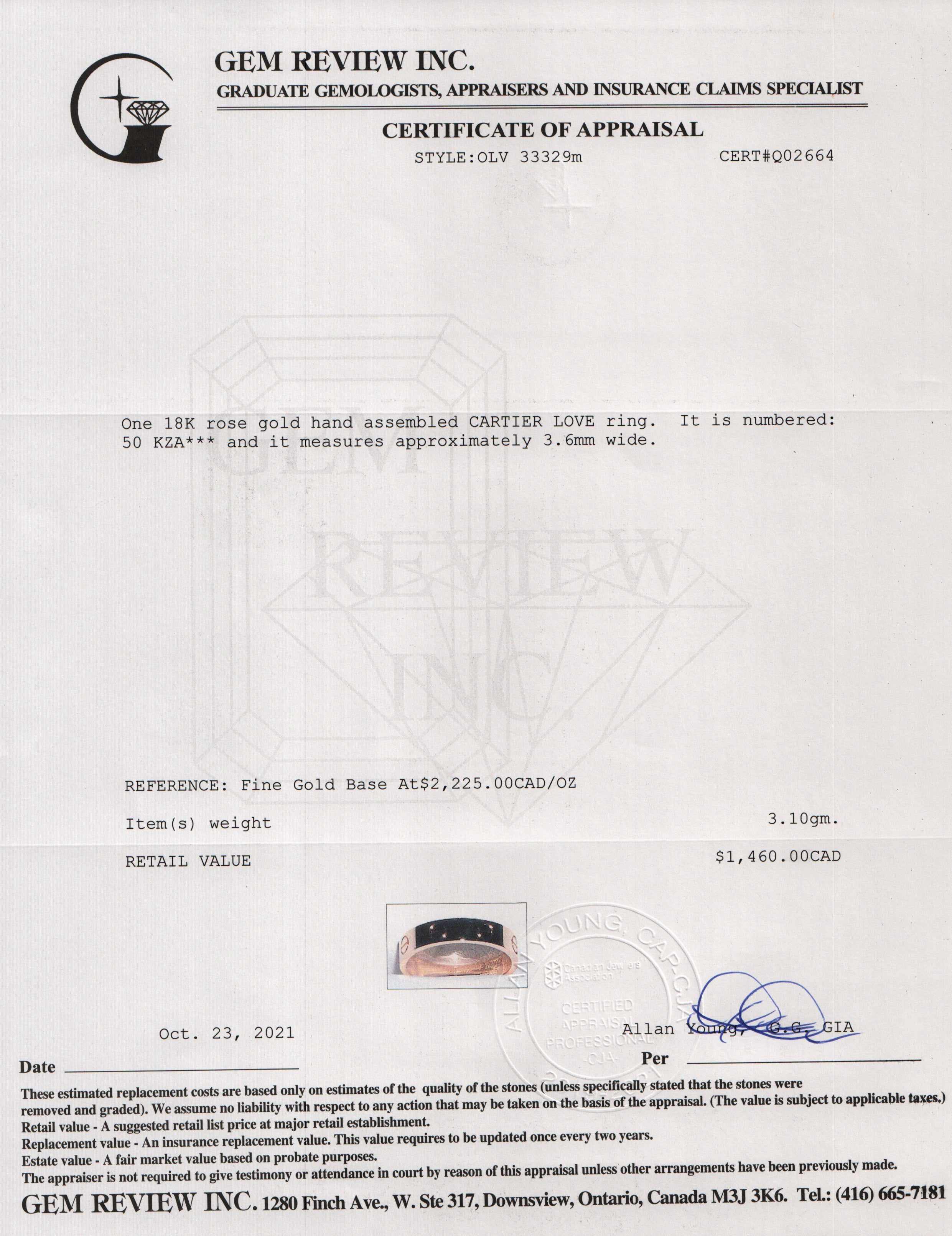 Included Items: Original Cartier Box & Certificate and Gem Review Appraisal