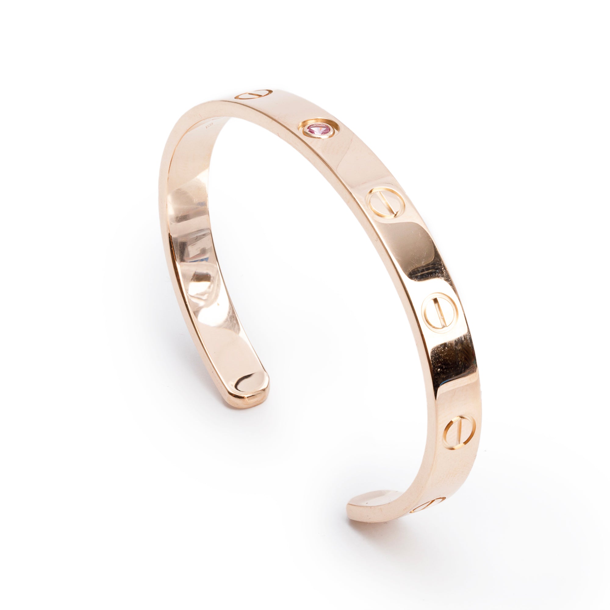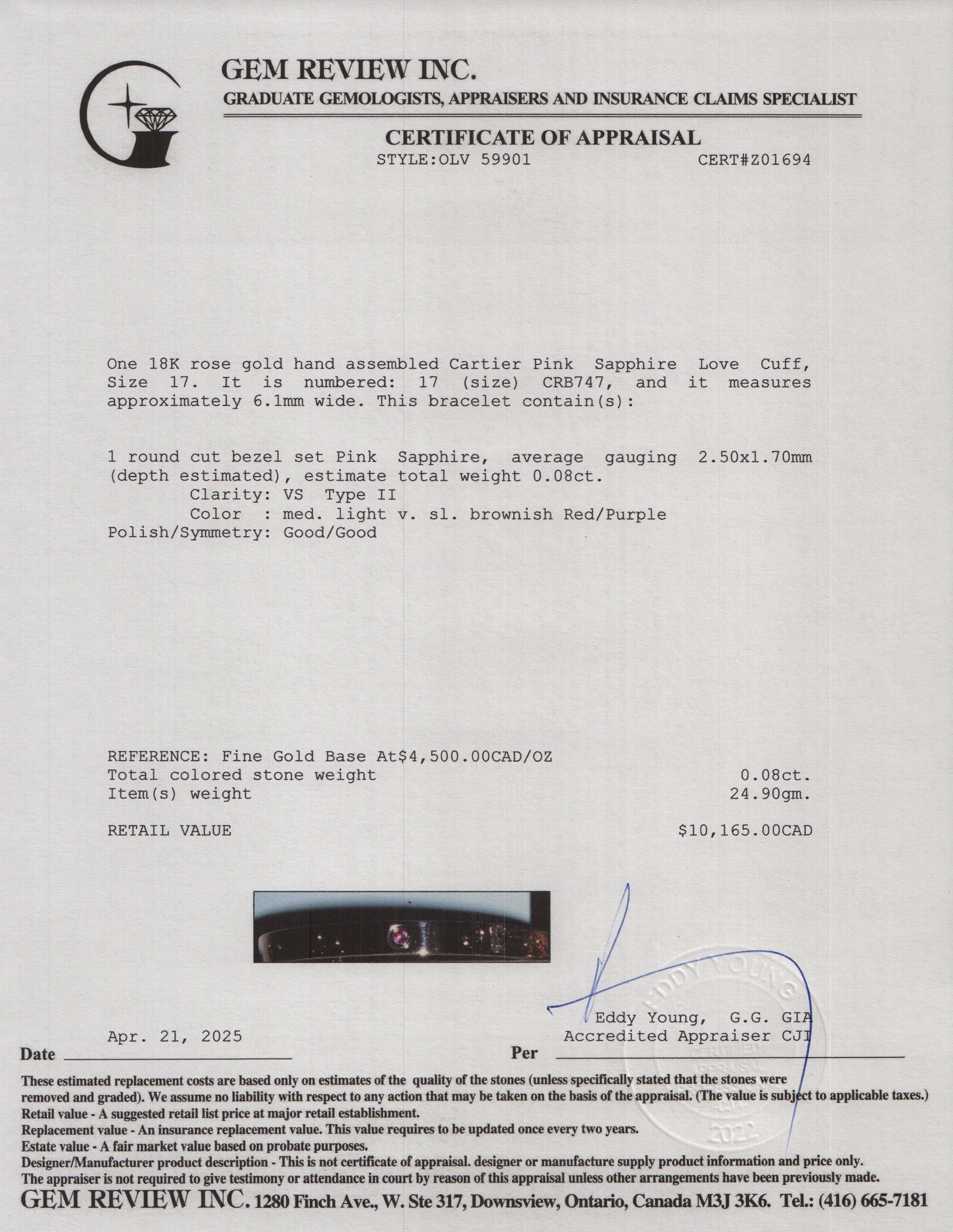 18k Rose Gold Pink Sapphire Love Cuff, Size 17 w/ Box & Receipt