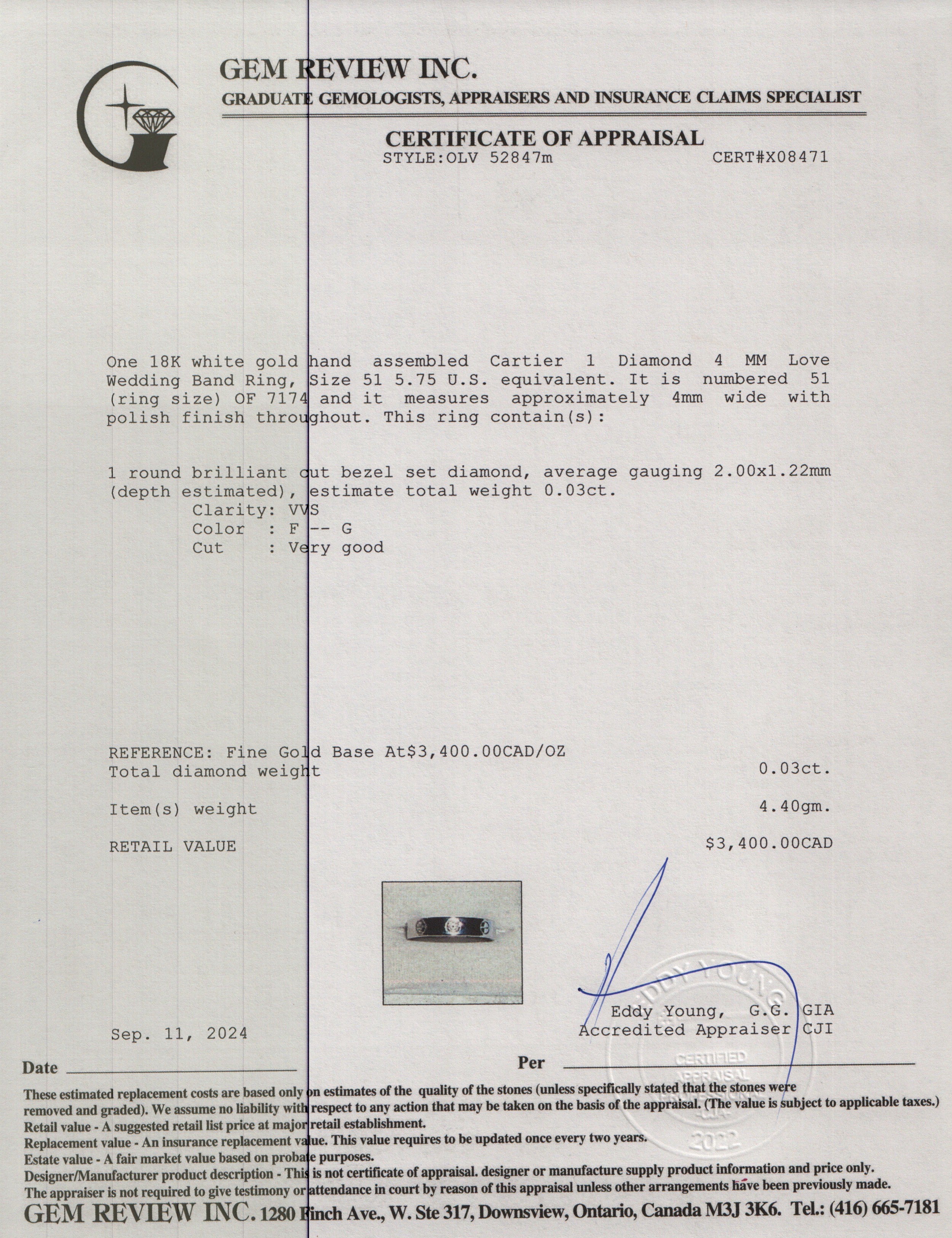 18k White Gold 1 Diamond 4 MM Love Wedding Band Ring, Size 51 5.75 w/ Certificate