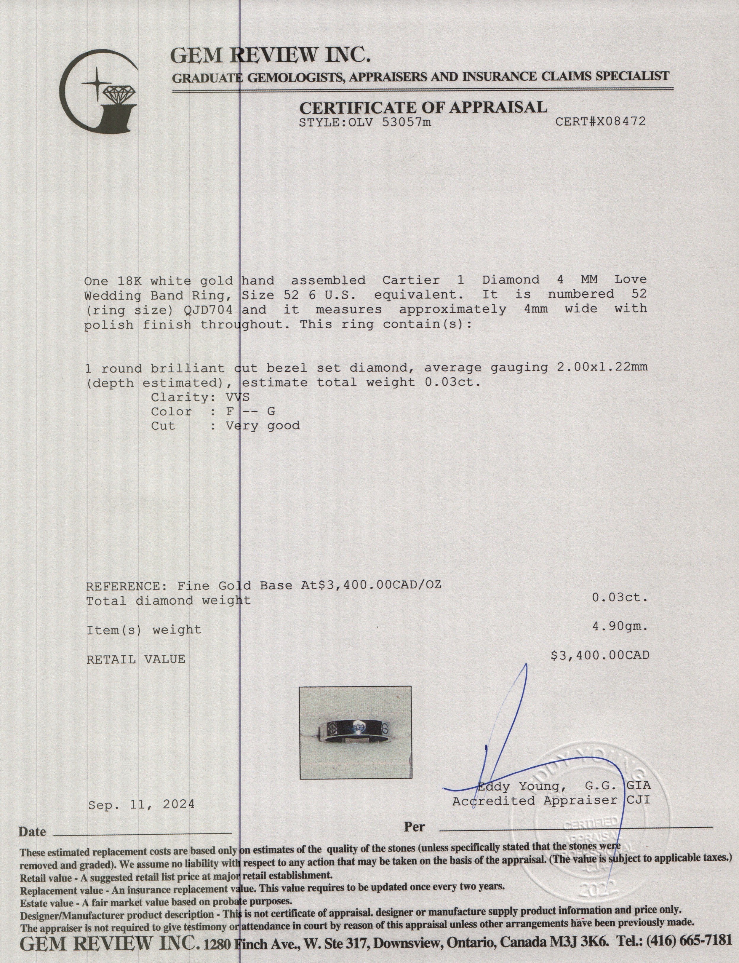 18k White Gold 1 Diamond 4 MM Love Wedding Band Ring, Size 52 6 w/ Box, Receipt & Certificate