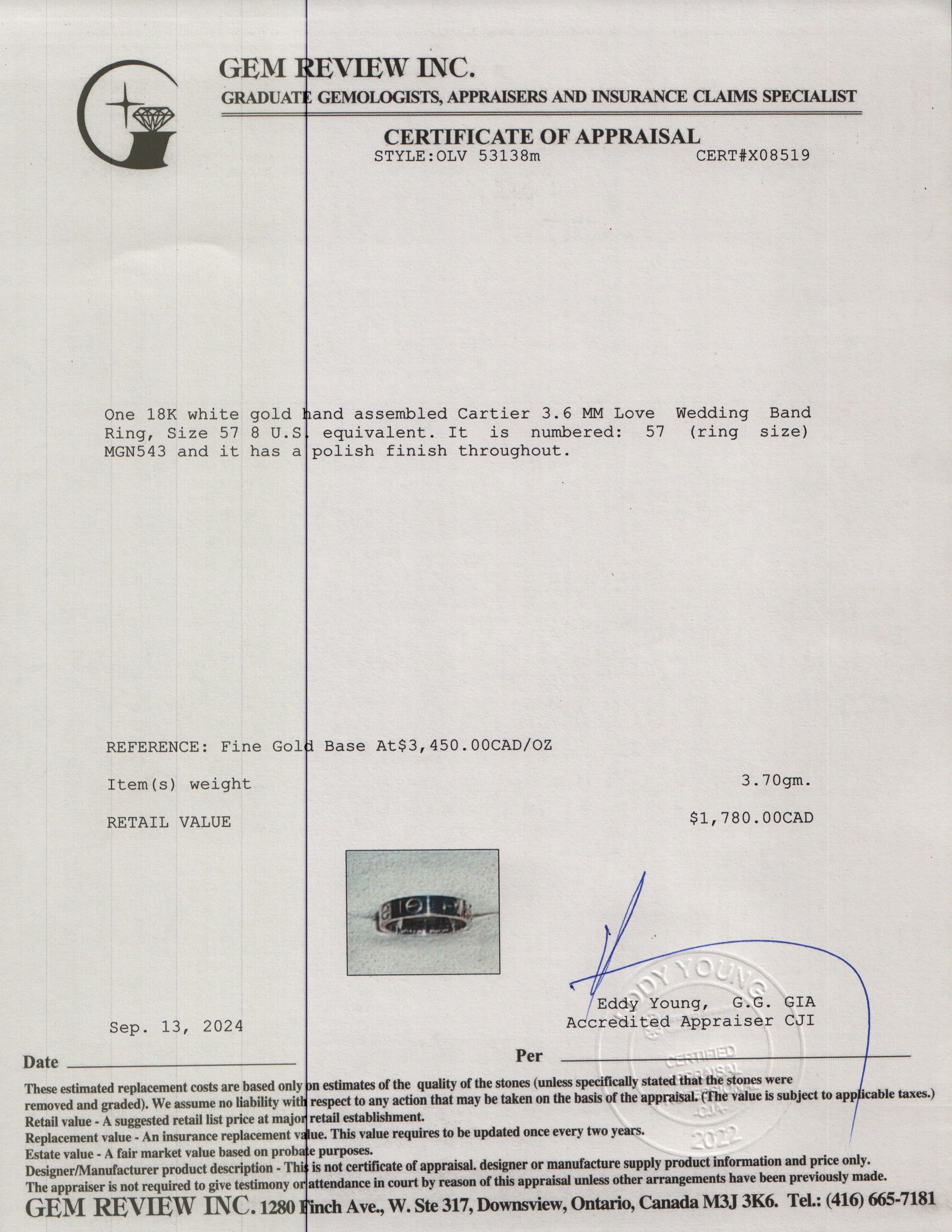 18k White Gold 3.6 MM Love Wedding Band Ring, Size 57 8 w/ Box
