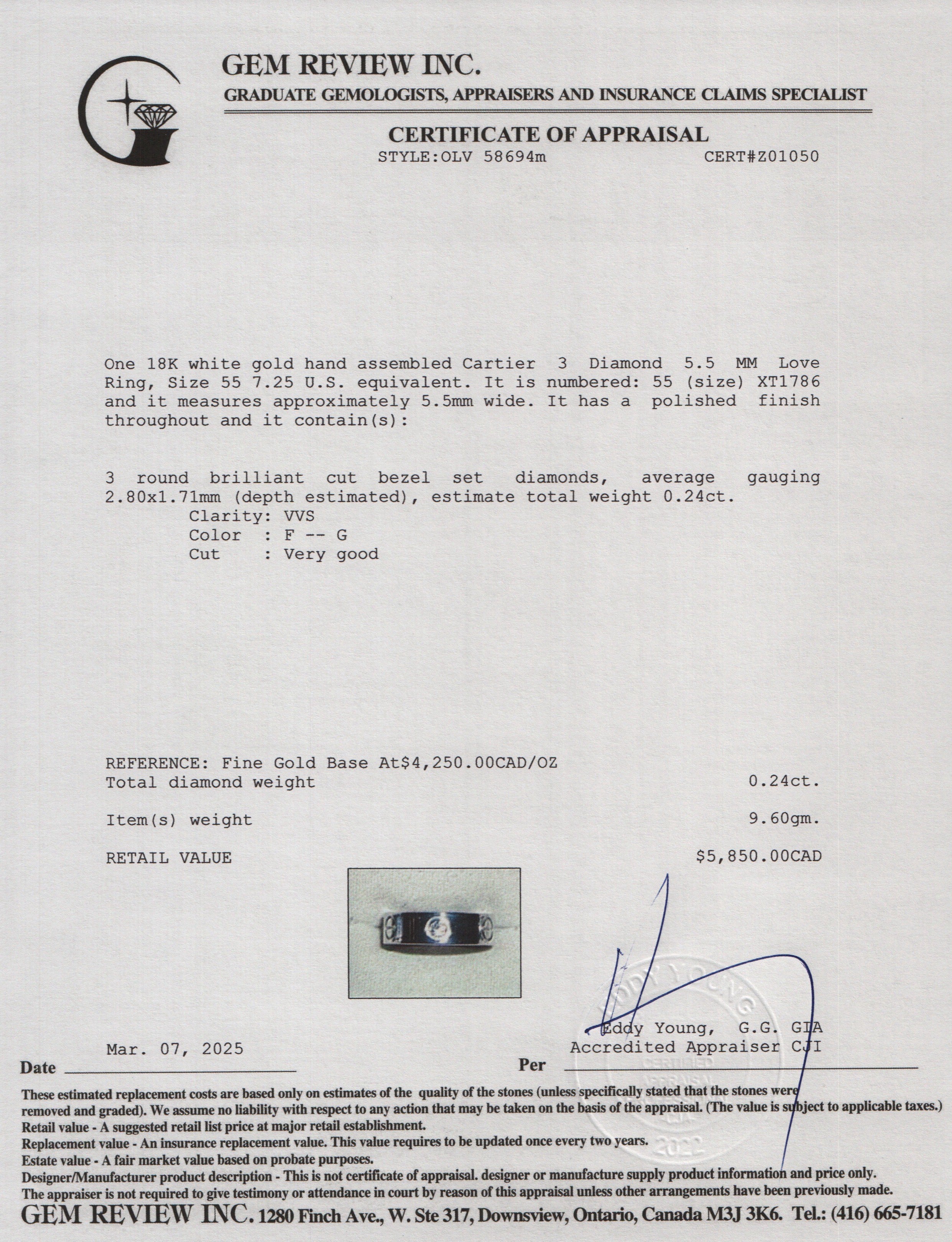 18k White Gold 3 Diamond 5.5 MM Love Ring, Size 55 7.25