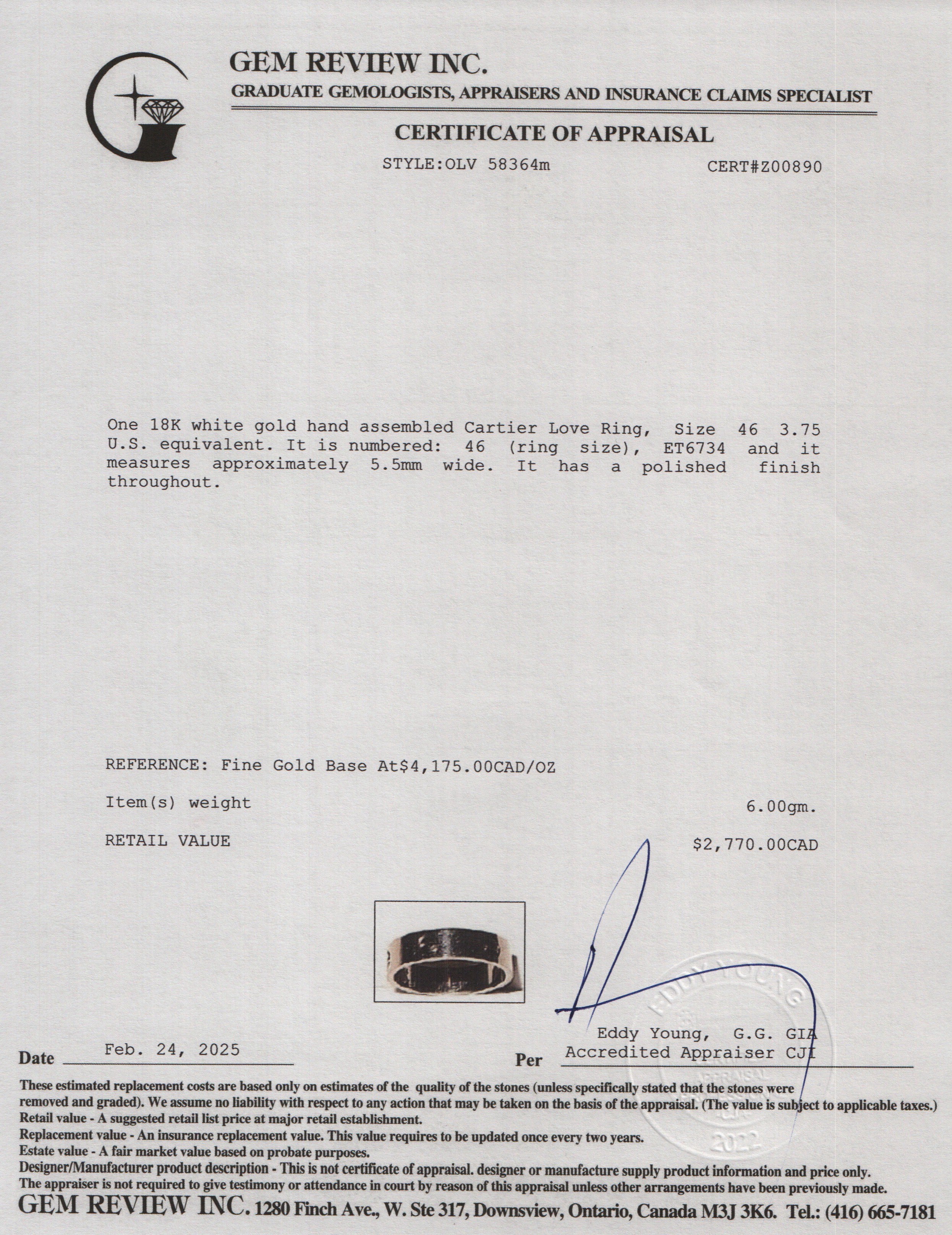 18k White Gold 5.5 MM Love Ring, Size 46 3.75