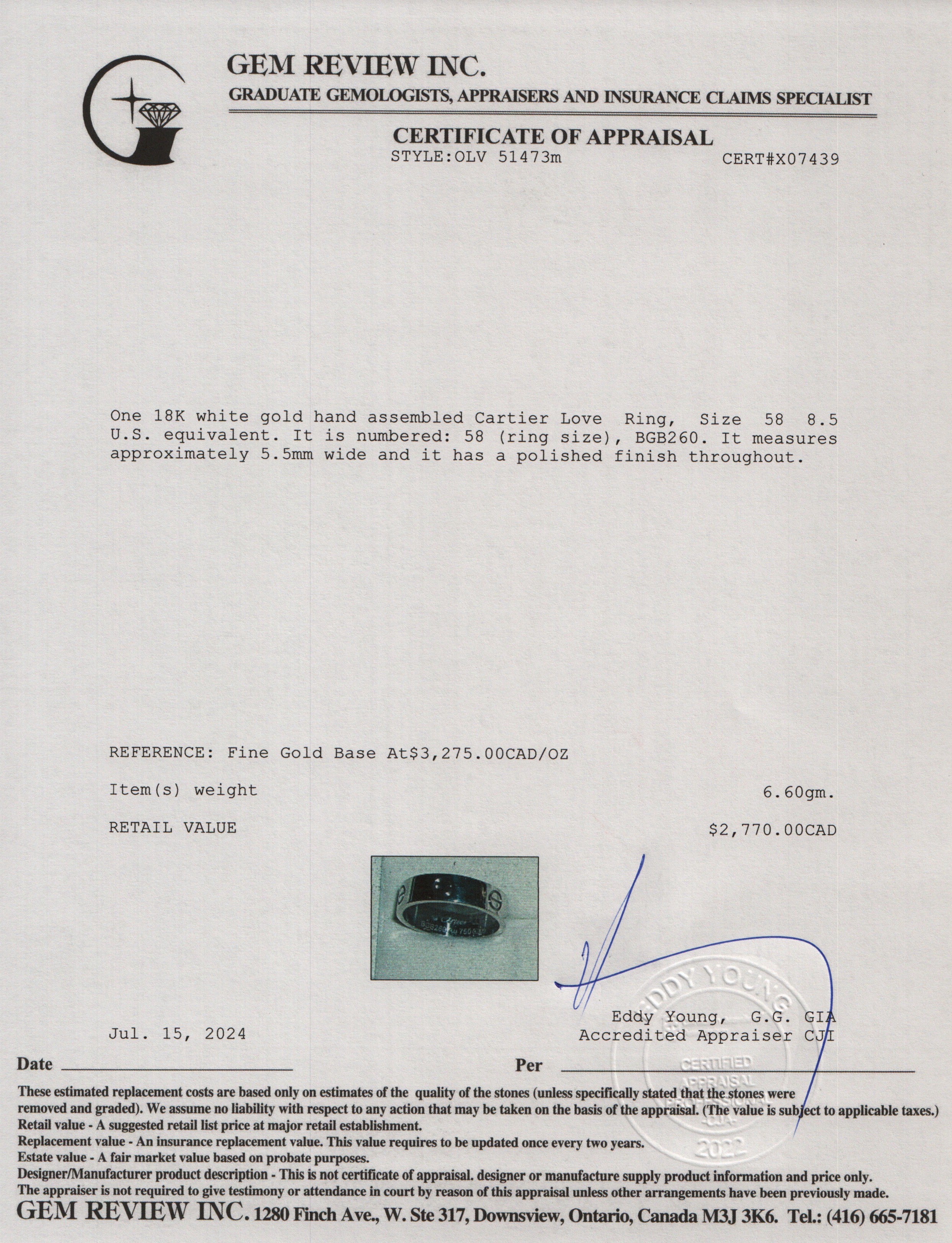 18k White Gold 5.5MM Love Ring, Size 58 8.5