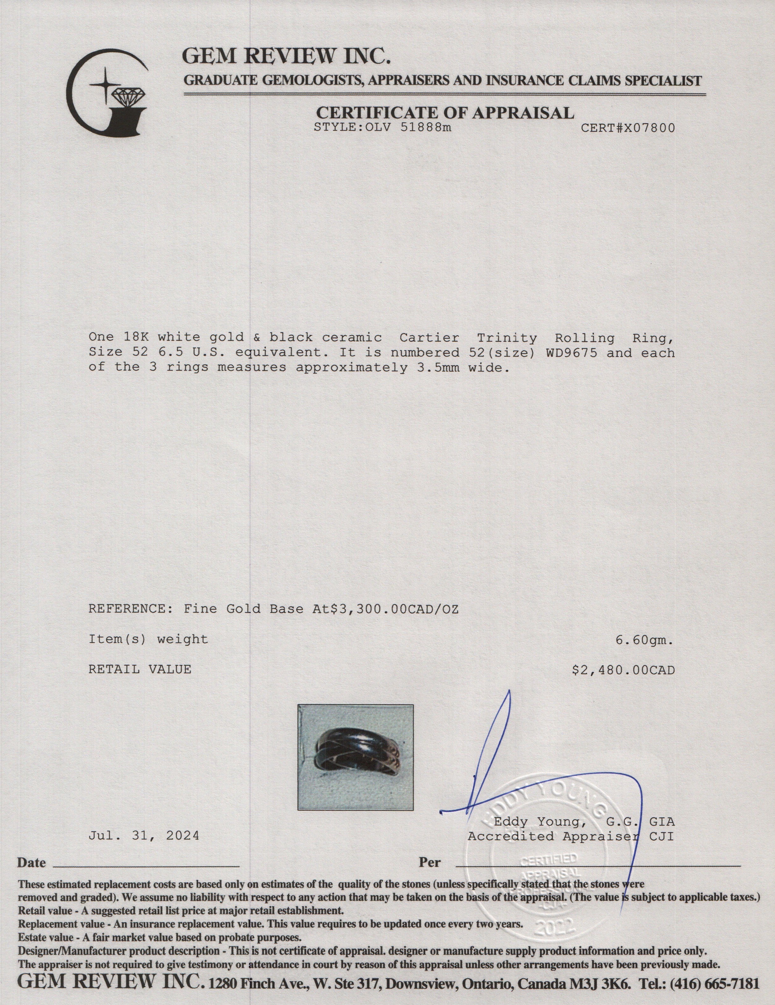 18k White Gold & Black Ceramic Trinity Rolling Ring, Size 52 6.5