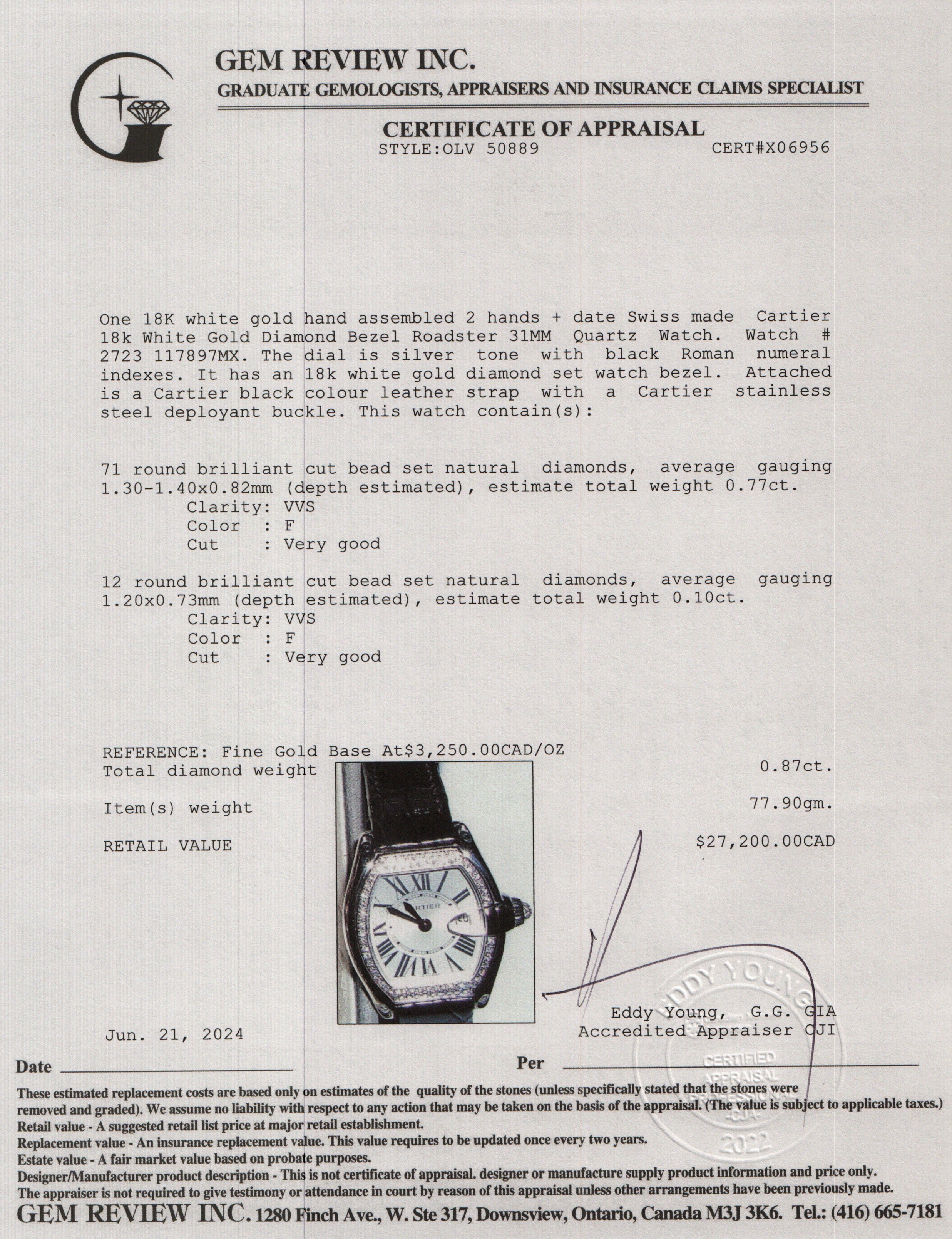 18k White Gold Diamond Bezel Roadster 31 MM Quartz Watch 2723 w/ Box, Extra Strap & Papers
