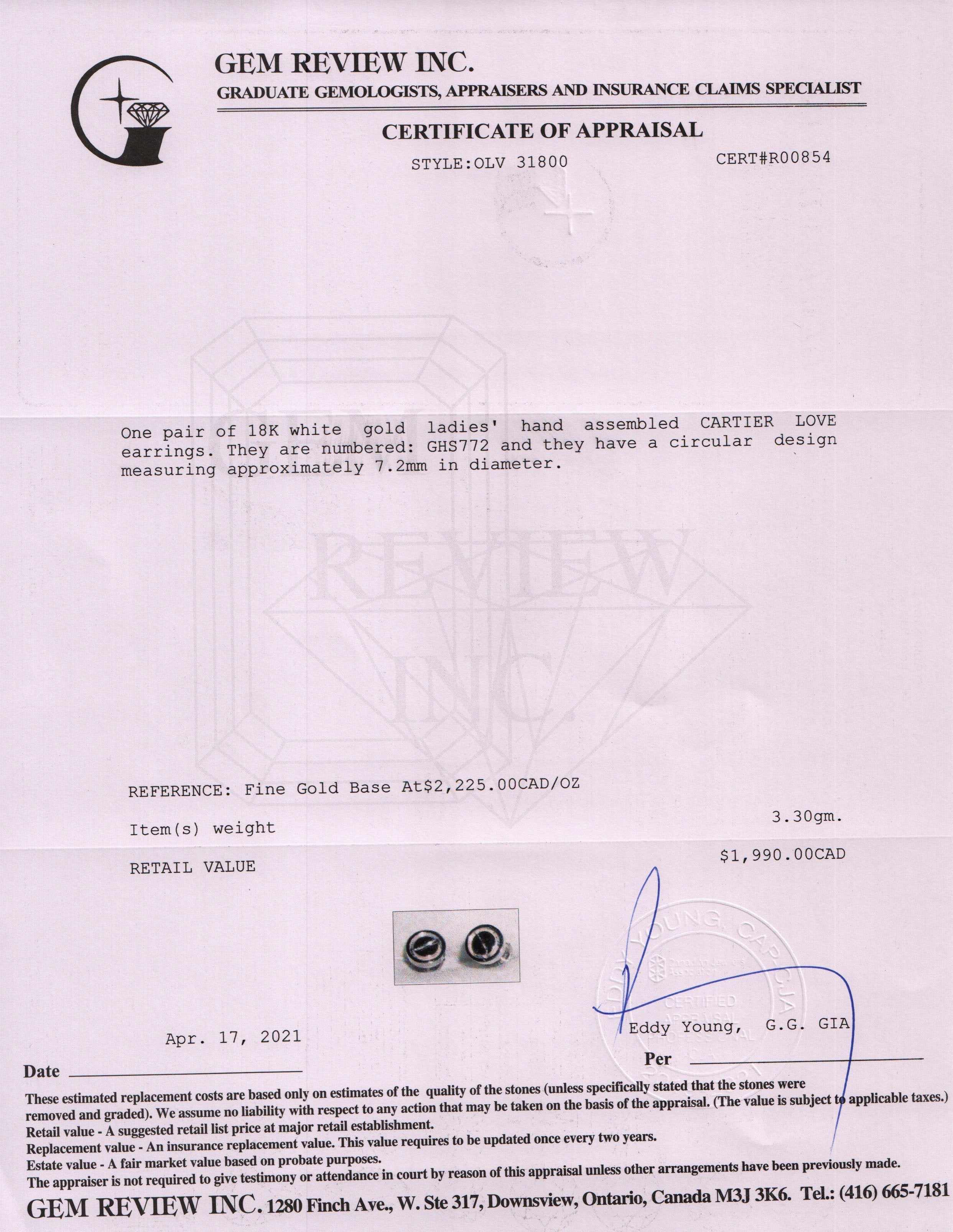 Included Items: Original Cartier Box & Certificate and Gem Review Appraisal