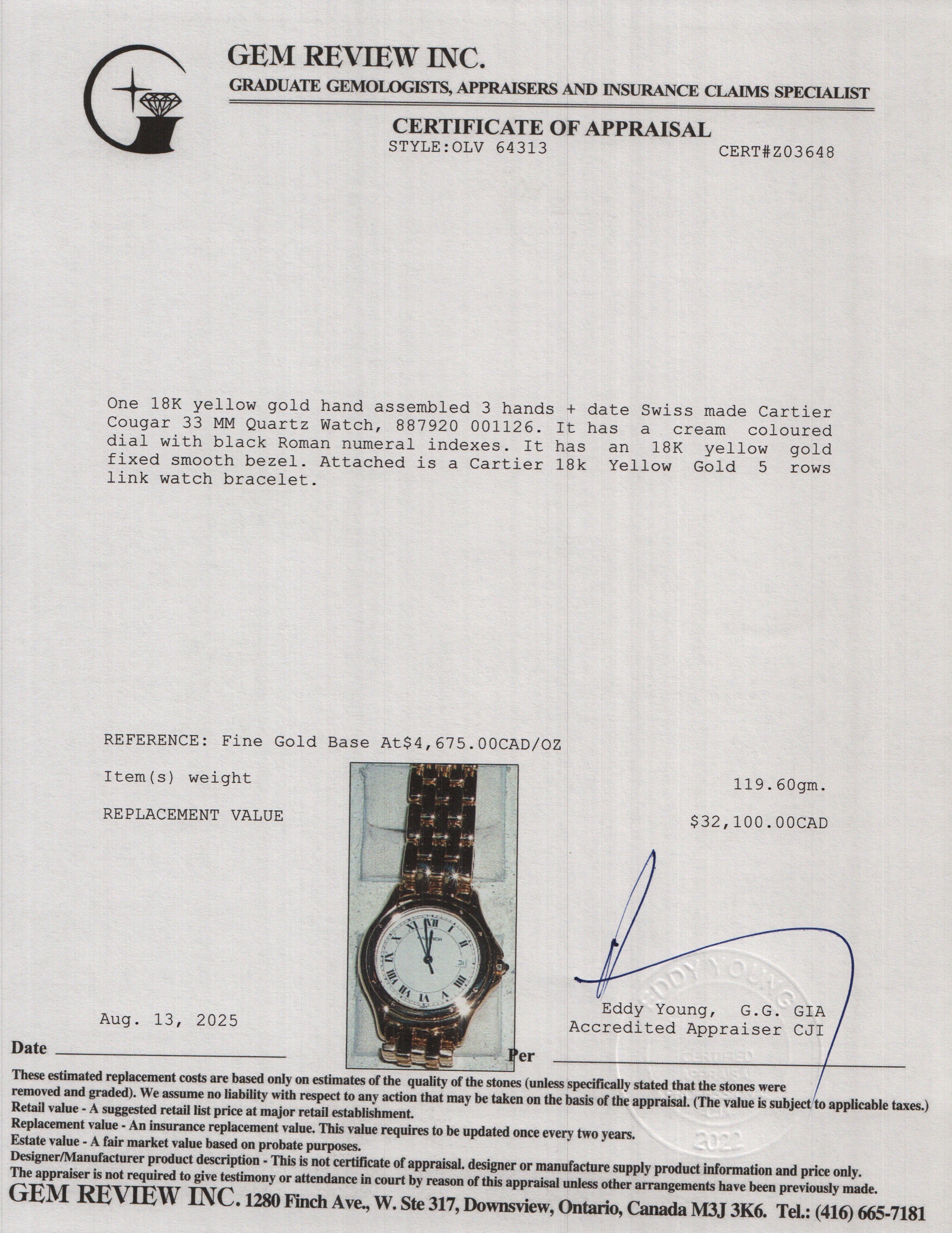 18k Yellow Gold Cougar 33 MM Quartz Watch