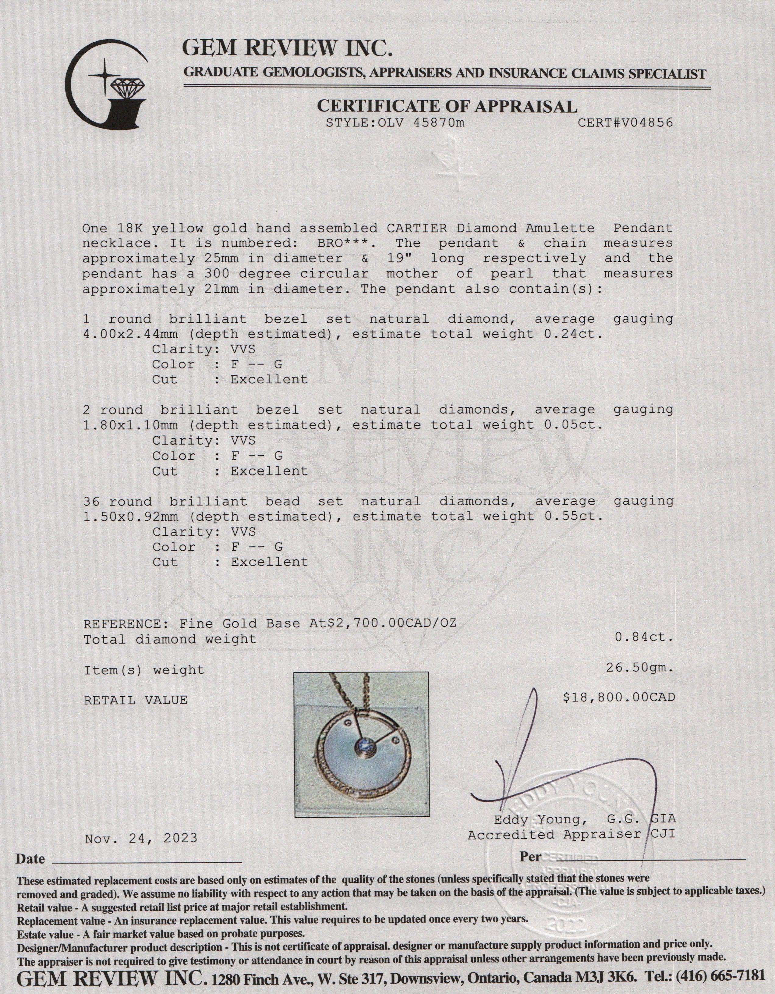 18k Yellow Gold Diamond Amulette de Mother of Pearl Large Pendant Necklace w/ Box