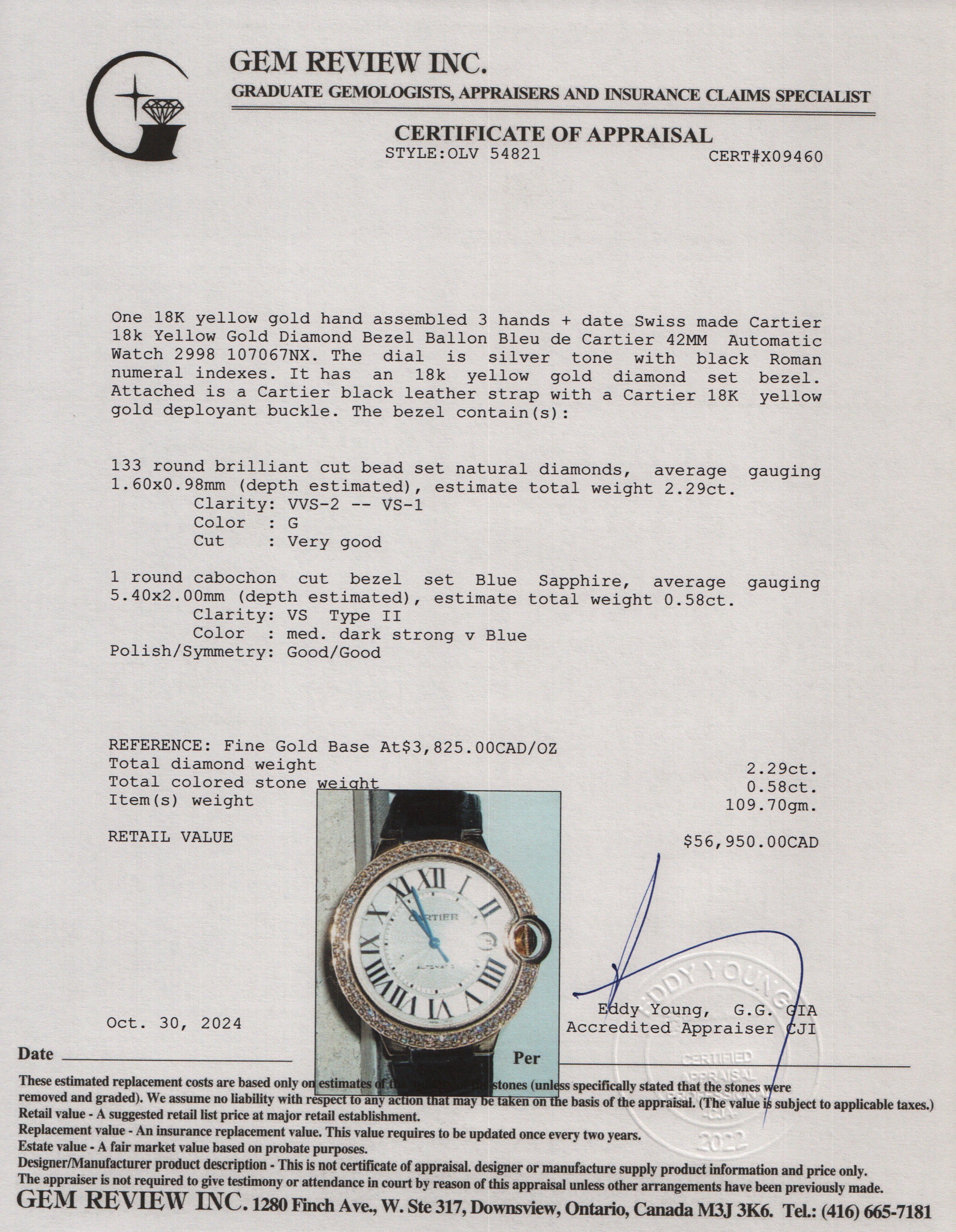 18k Yellow Gold Diamond Bezel Ballon Bleu de 42MM Automatic Watch 2998