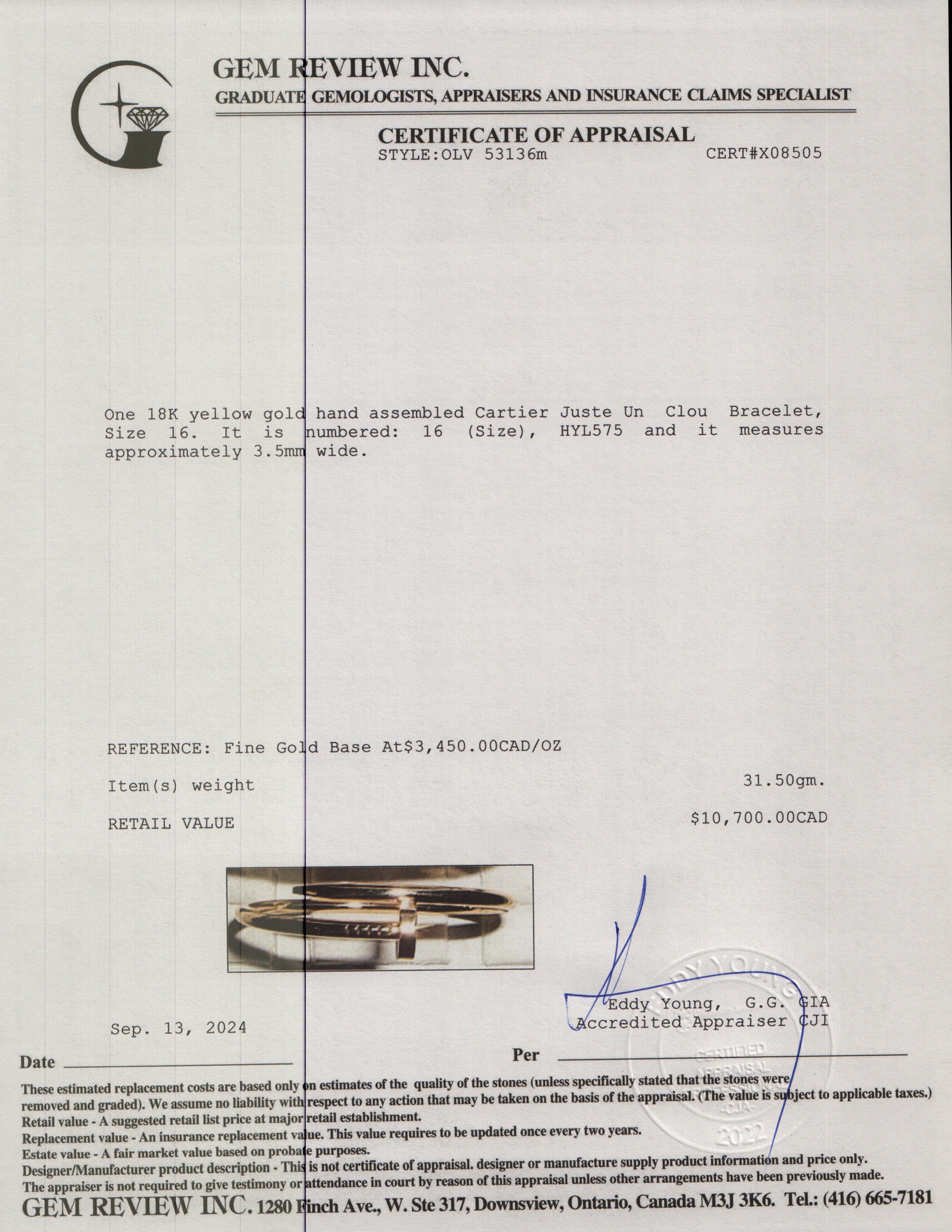 18k Yellow Gold Juste Un Clou Bracelet, Size 16 w/ Box