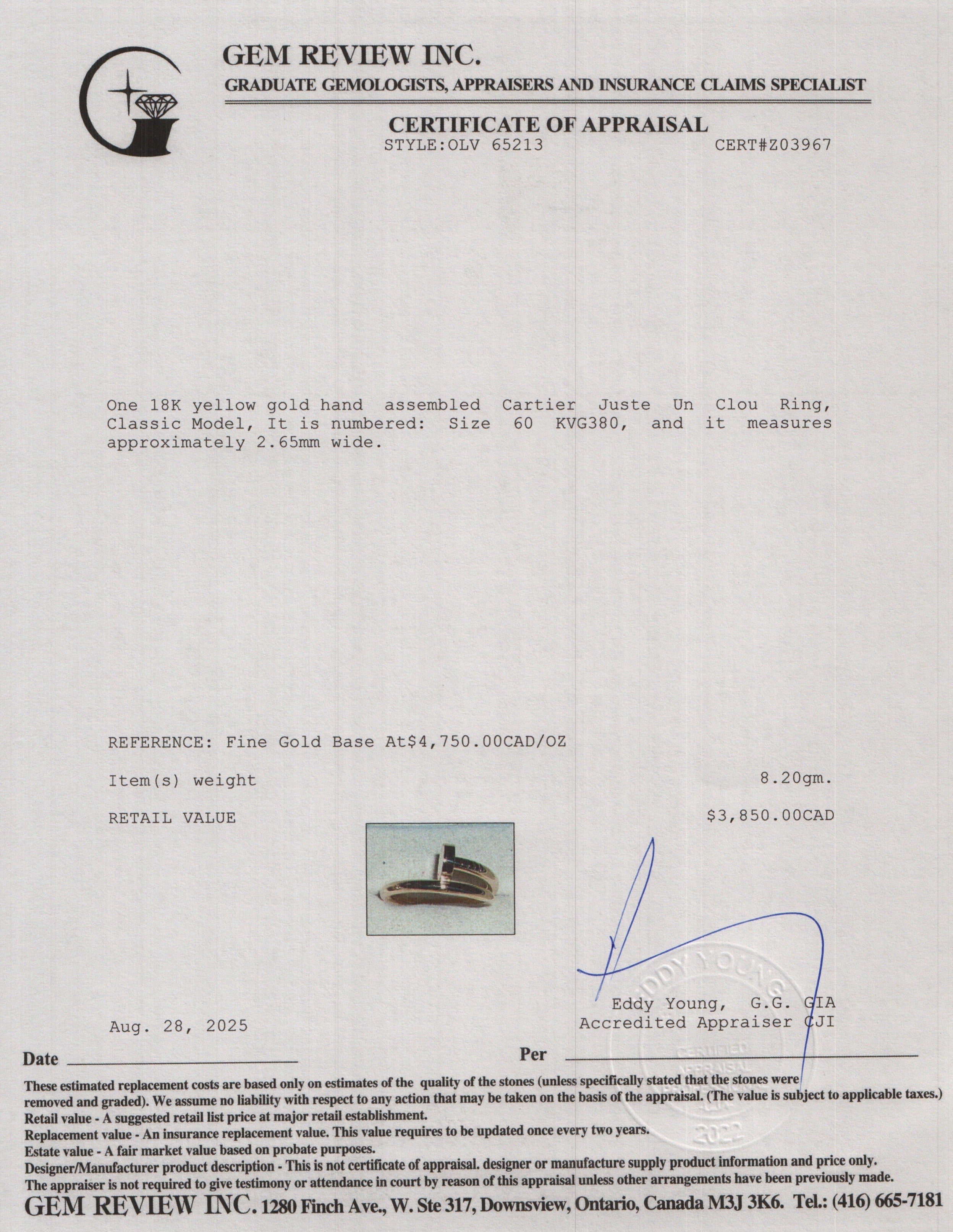 18k Yellow Gold Juste Un Clou Ring, Classic Model, Size 60 9 w/ Receipt