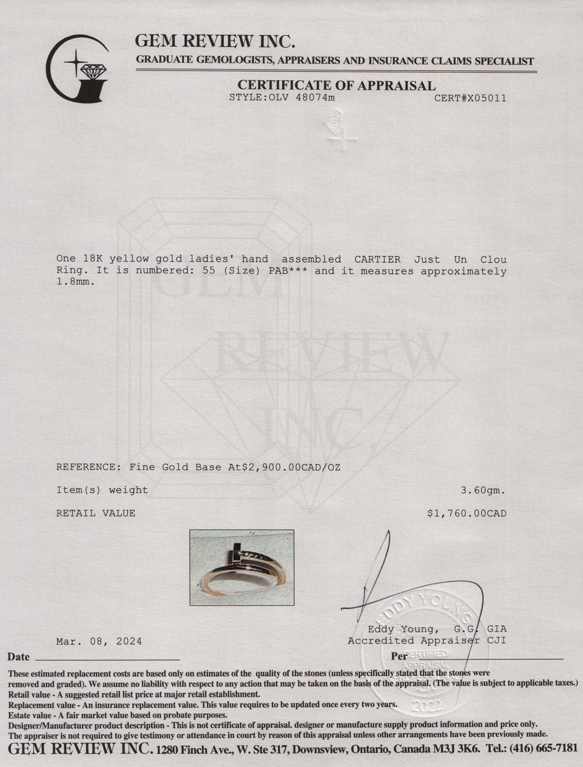 18k Yellow Gold Juste Un Clou Ring, Small Model, Size 55 7.25 w/ Box
