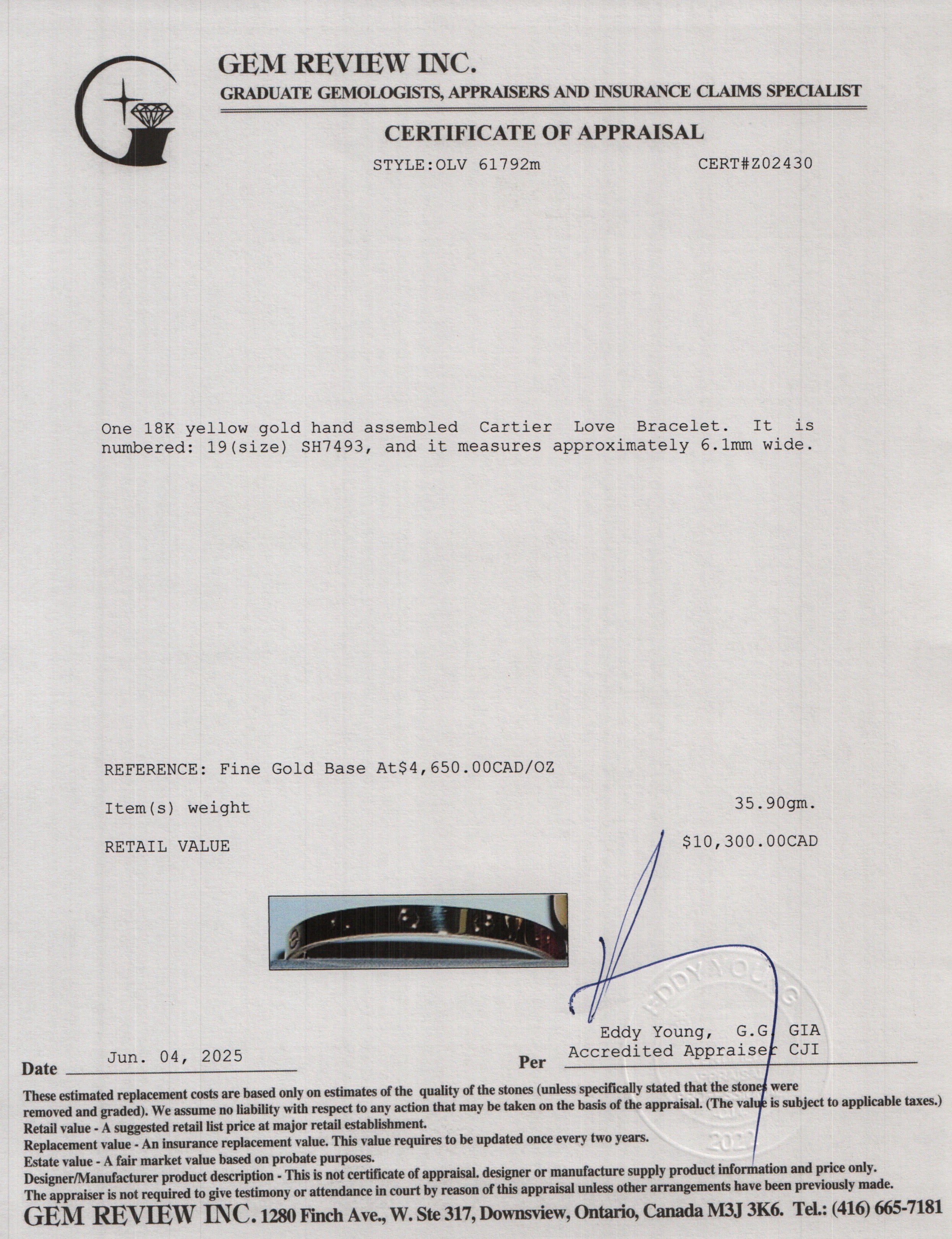 18k Yellow Gold Love Bracelet, Classic Model, Size 19 w/ Box & Certificate