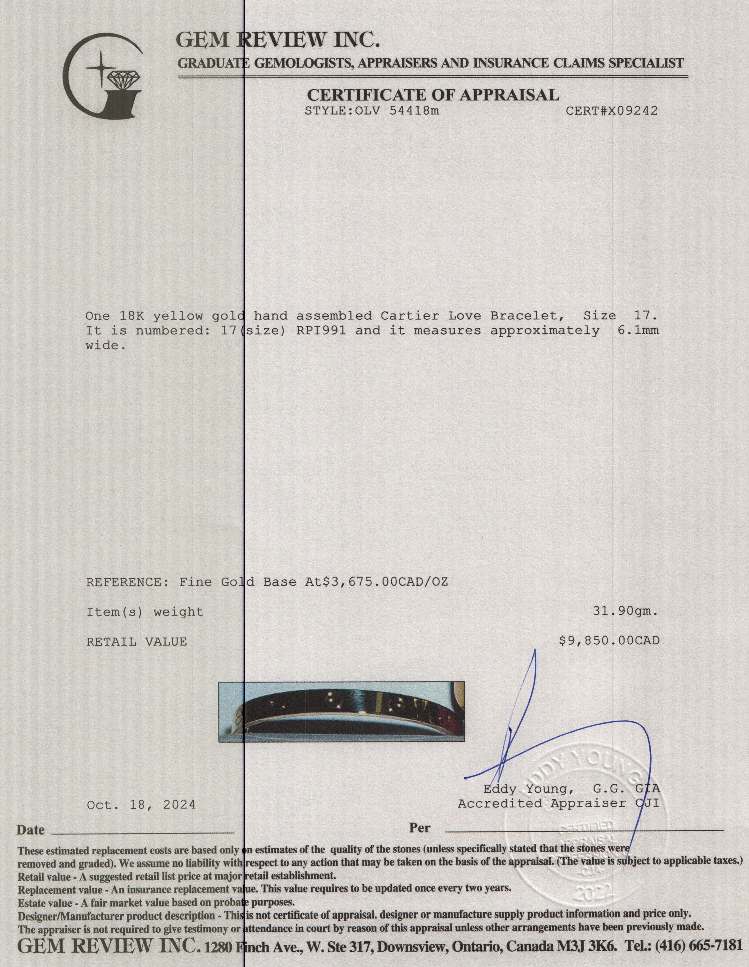 18k Yellow Gold Love Bracelet, Size 17 w/ Box & Certificate