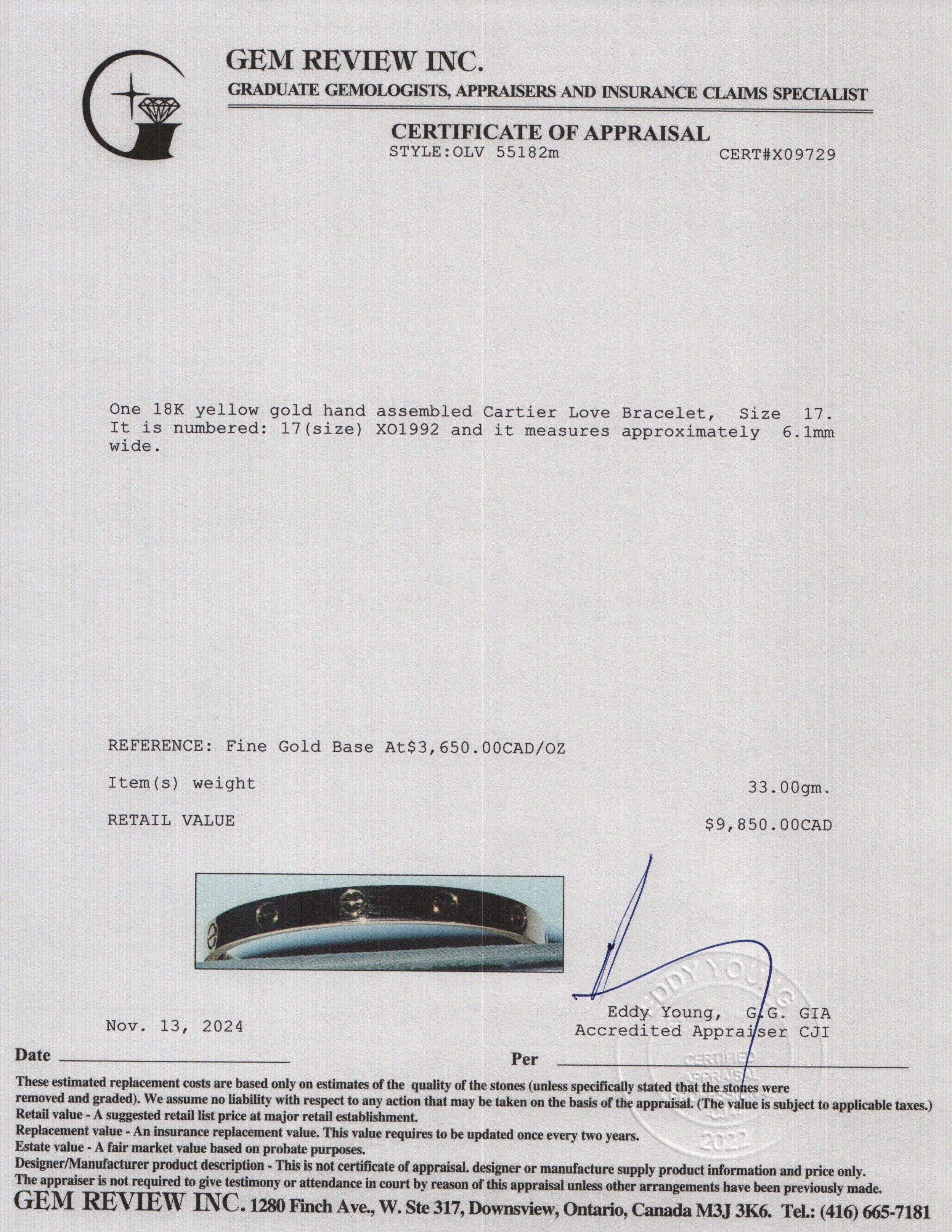 18k Yellow Gold Love Bracelet, Size 17 w/ Box & Certificate