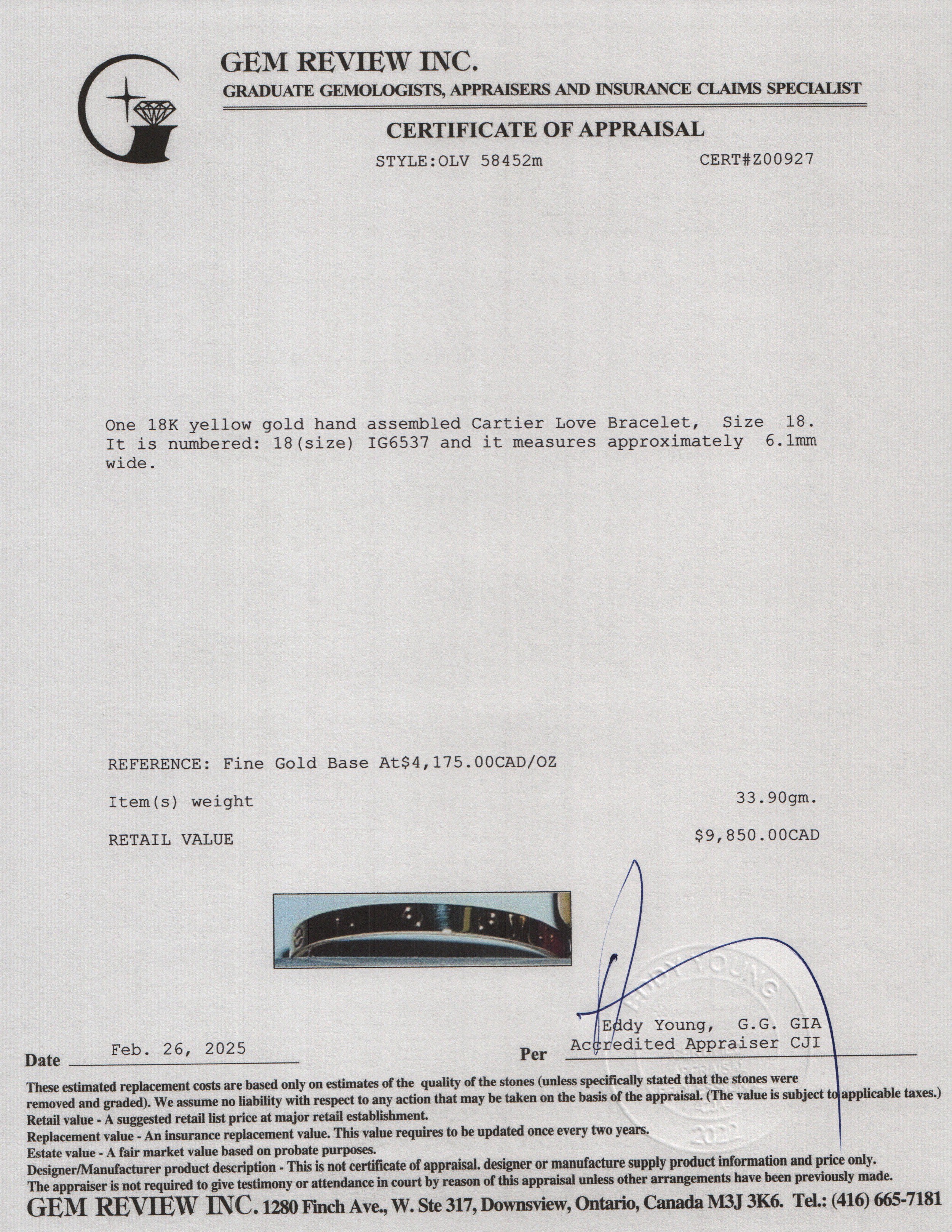 18k Yellow Gold Love Bracelet, Size 18 w/ Box