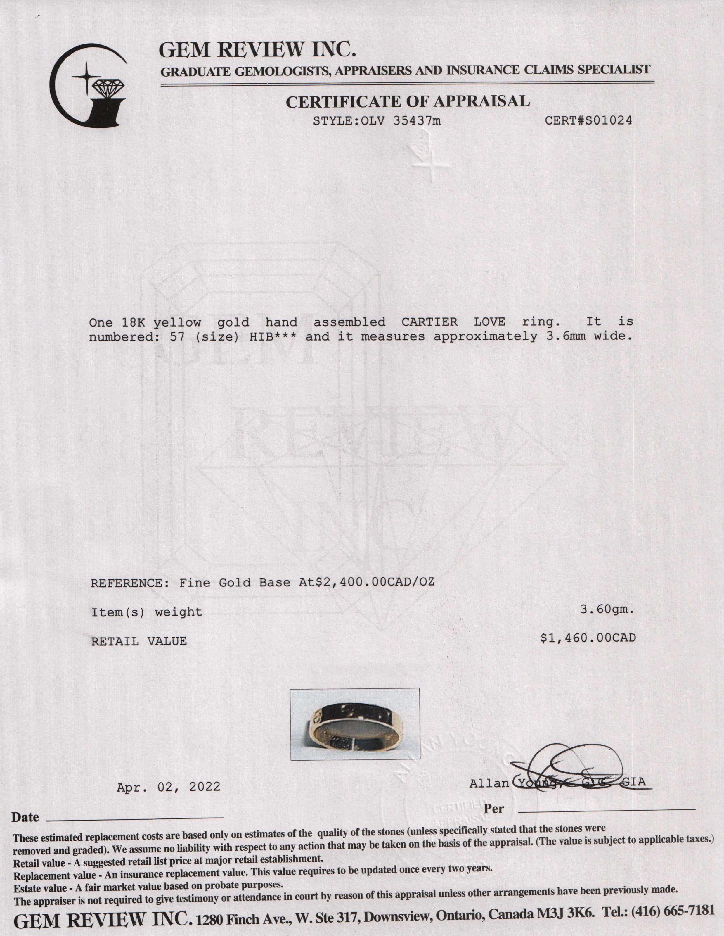 Included Items: Original Cartier Box & Gem Review Appraisal